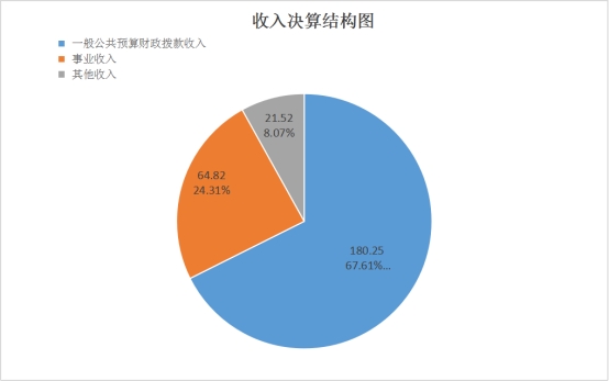 2022年本年收入合计266.59万元,其中:一般公共预算财政拨款收入180.25万元,占67.61%;政府性基金预算财政拨款收入0万元,占0%;国有资本经营预算财政拨款收入0万元,占0%;上级补助收入0万元,占0%;事业收入64.82万元,占24.31%;经营收入0万元,占0%;附属单位上缴收入0万元,占0%;其他收入21.52万元,占8.07%。