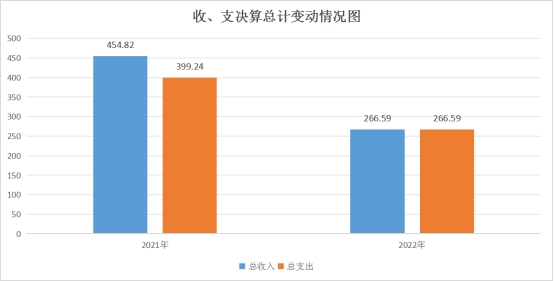 2022年度收入266.59万元,支出266.59万元。与2021年相比,收入减少188.23万元,下降41.39%,主要减少原因是新冠疫情防控影响,人口基数减少;支出减少132.65万元,下降33.23%。主要变动原因是物资支出减少。