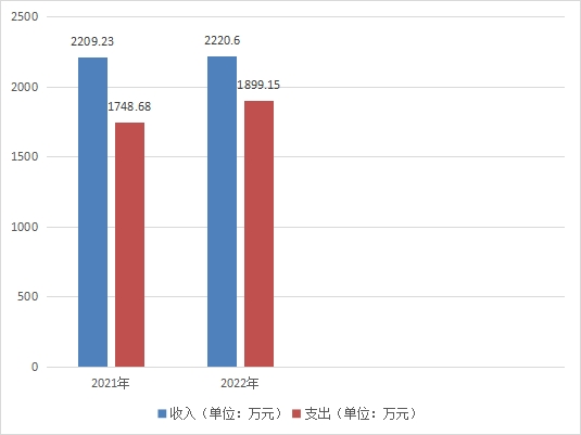 2022年度收入总计2220.60万元、支出总计1899.15万元。与2021年相比,收入增加11.37万元,增长比例为0.51%;支出增加150.47万元,增长比例为8.60%。主要变动原因本年度人员增加,人员经费收支明显增加,医疗新业务的开展导致医疗成本增加。如图1: