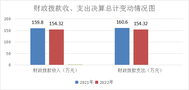 2022年财政拨款收入总计154.32万元,支出总计154.32万元。与2021年相比,财政拨款收入总计减少5.48万元,减少3.4%;支出总计减少6.28万元,减少3.9%。主要变动原因是人员经费变动。