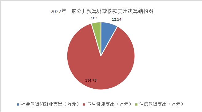 2022年一般公共预算财政拨款支出154.32万元,主要用于以下方面:一般公共服务(类)支出0万元,占0%;教育支出(类)0万元,占0%;科学技术(类)支出0万元,占0%;文化旅游体育与传媒(类)支出0万元,占0%;社会保障和就业(类)支出12.54万元,占8.12%;卫生健康支出134.75万元,占87.32%;住房保障支出7.03万元,占4.56%。