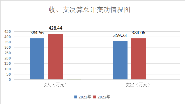 2022年度收入总计428.44万元,支出总计384.06万元。与2021年相比,收入总计增加43.88万元,增加11.41%;支出总计增加24.83万元,增加6.9%。主要变动原因是人员经费变动、医疗业务上涨、基本支出增加。