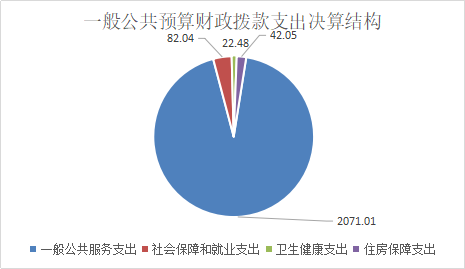 2023年一般公共预算财政拨款支出2221.15万元,主要用于以下方面:一般公共服务(类)支出2071.01万元,占93.24%;社会保障和就业(类)支出82.04万元,占3.7%;卫生健康支出22.48万元,占1.01%;农林水支出3.57万元,占0.16%住房保障支出42.05万元,占1.89%。