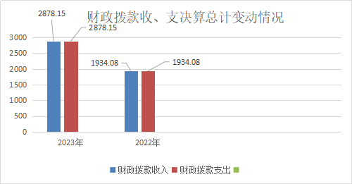 2023年财政拨款收、支总计2878.15万元。与2022年相比,财政拨款收、支总计各增加944.07万元,增长48.8%。主要变动原因是2023年政府投资项目审计经费支出增加,人员增加。