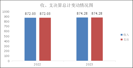 2023年度收、支总计874.28万元。与2022年相比,收、支总计各增加2.25万元,增长0.26%。主要变动原因是2023基本支出增多。
