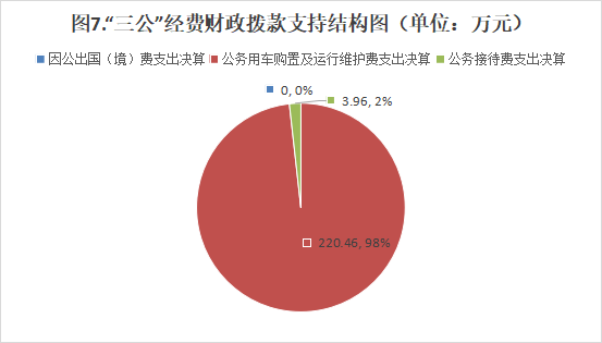2023年“三公”经费财政拨款支出决算中,因公出国(境)费支出决算0万元,占0%;公务用车购置及运行维护费支出决算220.46万元,占98%;公务接待费支出决算3.96万元,占2%。具体情况如下: