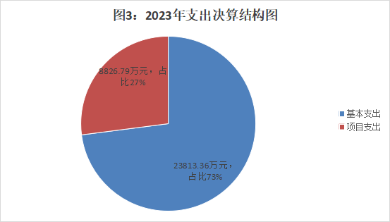 2023年本年支出合计32640.15万元,其中:基本支出23813.36万元,占73%;项目支出8826.79万元,占27%。