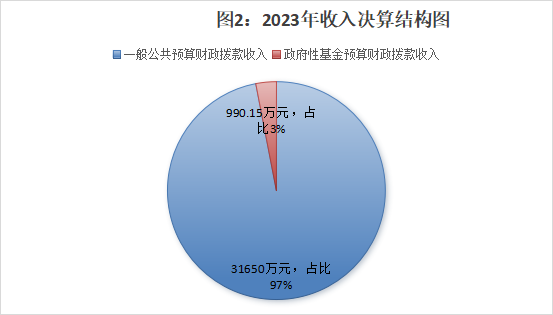 2023年本年收入合计32640.15万元,其中:一般公共预算财政拨款收入31650万元,占97%;政府性基金预算财政拨款收入990.15万元,占3%。
