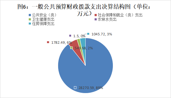 2023年一般公共预算财政拨款支出31650万元,主要用于以下方面:公共安全(类)28270.59万元,占89%;社会保障和就业(类)支出1782.49万元,占6%;卫生健康支出549.68万元,占2%;农林水支出1.5万元,占0%;住房保障支出1045.72万元,占3%。