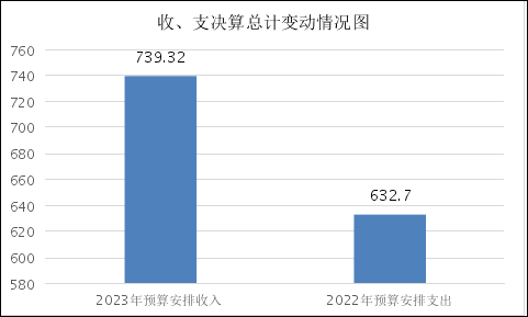 2023年度收、支总计739.32万元。与2022年相比,收、支总计各增加106.62万元,增长16.85%。主要变动原因是按照要求,增加县级退休干部生活补贴项目。