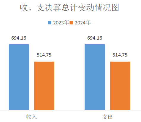 2024年度收入、支出总计均为514.75万元。与2023年度694.16万元相比,收入、支出总计各减少179.41万元,下降25.8%。主要变动原因是2024年年初预算结合供销社综合改革进度,减少了综合改革项目开支,压缩了公用经费(见柱形图)。