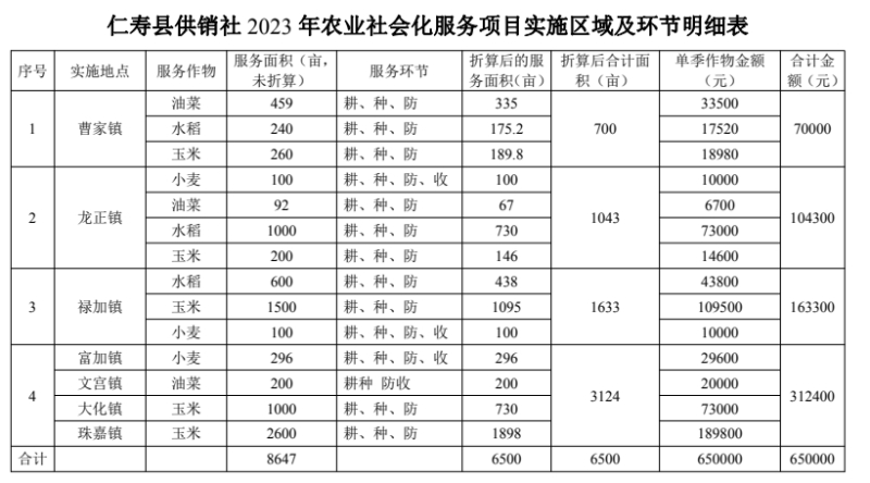 中央财政通过川财农〔2023〕86号文件下达仁寿县供销合作社农业社会化服务试点资金65万元,占全县农业经营主体能力提升资金的4.9%,专项用于粮食生产托管服务补助。