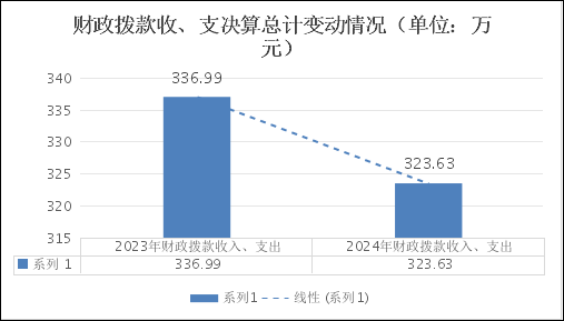 2024年度财政拨款收入、支出总计均为323.63万元。与2023年度相比,财政拨款收入总计、支出总计各减少13.36万元,下降4%。主要变动原因是2024年项目经费支出减少、2023年追加退休人员离退休费等。