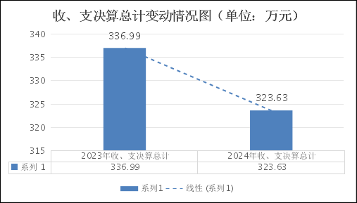 2024年度收入、支出总计均为323.63万元。与2023年度相比,收入、支出总计各减少13.36万元,下降4%。主要变动原因是2024年项目经费支出减少、2023年追加退休人员离退休费等。