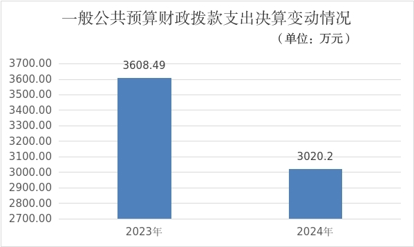 2024年度一般公共预算财政拨款支出3020.20万元,占本年支出合计的100%。与2023年度相比,一般公共预算财政拨款支出减少588.29万元,下降16.30%。主要变动原因是抗疫物资项目支出减少。