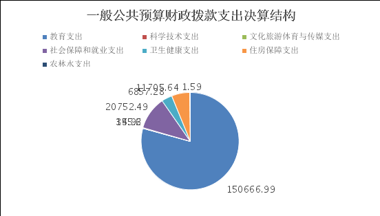 2024年度一般公共预算财政拨款支出190165.52万元,主要用于以下方面:教育支出150666.99万元,占79.23%;科学技术支出35.92万元,占0.02%;文化旅游体育与传媒支出145.6万元,占0.08%;社会保障和就业支出20752.49万元,占10.91%;卫生健康支出6857.28万元,占3.60%;住房保障支出11705.64万元,占6.16%,农林水支出1.59万元,占0.0008%。