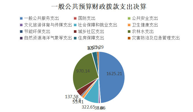 2024年度一般公共预算财政拨款支出3333.24万元,主要用于以下方面:一般公共服务支出1625.21万元,占48.76%;国防支出6万元,占0.18%;公共安全支出8.06万元,占0.24%;文化旅游体育与传媒支出33.86万元,占1.02%;社会保障和就业支出322.65万元,占9.68%;卫生健康支出55.41万元,占1.66%;节能环保支出24.8万元,占0.74%;城乡社区支出137.58万元,占4.13%;农林水支出970.14万元,占29.11%;自然资源海洋气象等支出8.5万元,占0.26%;住房保障支出105.76万元,占3.17%;灾害防治及应急管理支出35.29万元,占1.06%。