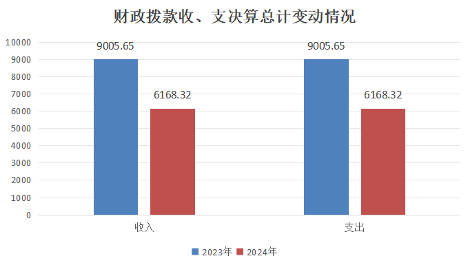 2024年度财政拨款收入、支出总计均为6168.32万元。与2023年度相比,财政拨款收入总计、支出总计各减少2837.33万元,下降31.51%。主要变动原因是厉行节约、项目减少。