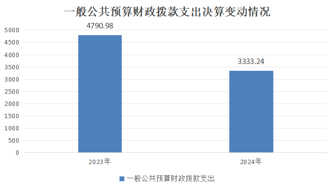 2024年度一般公共预算财政拨款支出3333.24万元,占本年支出合计的54.04%。与2023年度相比,一般公共预算财政拨款支出减少1457.74万元,增长/下降30.43%。主要变动原因是厉行节约、项目减少。