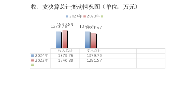 2024年度收入总计1379.76万元,支出总计1379.76万元。与2023年相比,收入总计减少161.13万元,下降11.68%;支出总计增长98.19万元,增长7.12%。收入主要变动原因是受医保基金政策限制,医疗业务量下降;支出主要变动原因是医保罚款增加。(图1:收、支决算总计变动情况图)