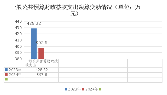 2024年一般公共预算财政拨款支出397.60万元,占本年支出合计的28.82%。与2023年相比,一般公共预算财政拨款支出减少30.72万元,下降7.73%。主要变动原因是2024年有一名在编人员辞职,减少了人员经费。