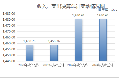 2024年度收入总计为1480.43万元,支出总计为1480.43万元。与2023年度相比,收入总计增加21.67万元,增加1.49%;支出总计增加21.67万元,增加1.49%。主要原因是工资类人员增加,经费增加。