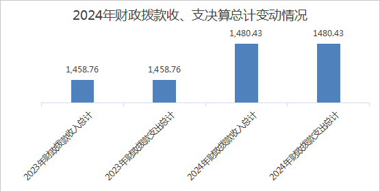 2024年度财政拨款收入总计为1480.43万元,财政拨款支出总计为1480.43万元。与2023年度相比,财政拨款收入增加21.67万元,增加1.49%;支出总计增加21.67万元,增加1.49%。主要原因是工资类人员增加经费增加。