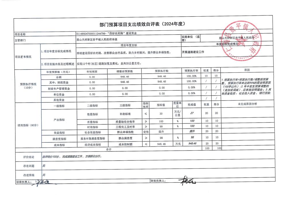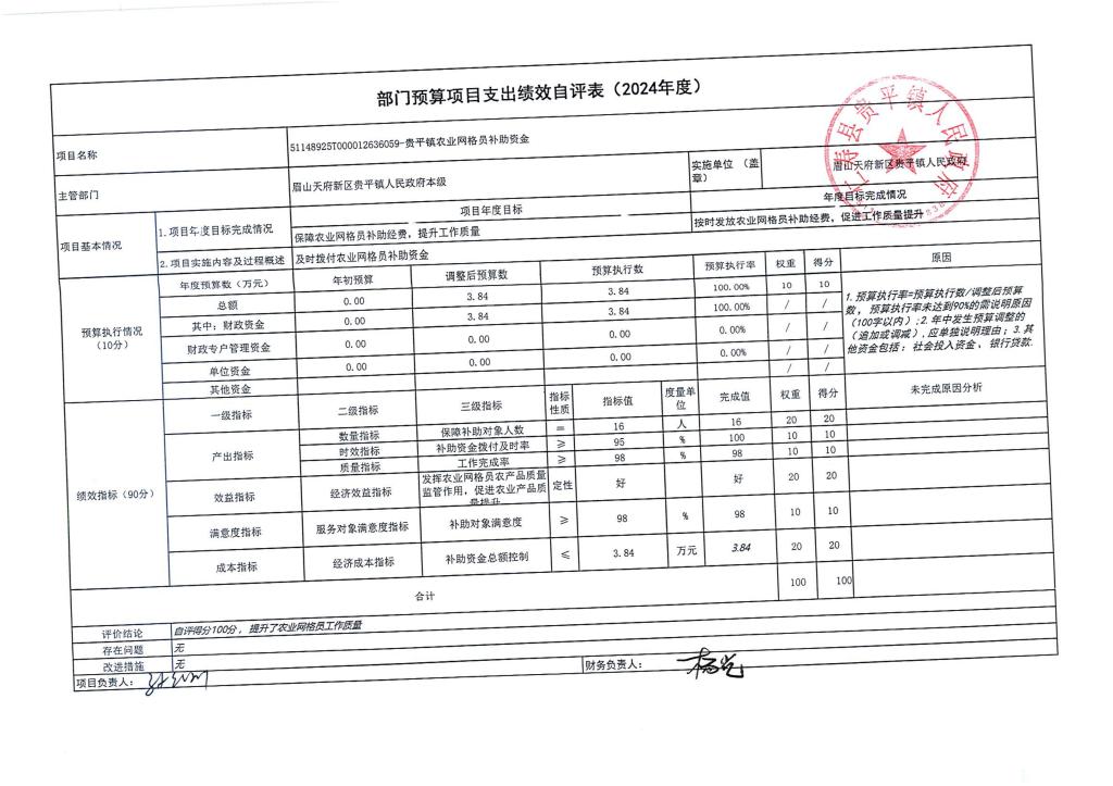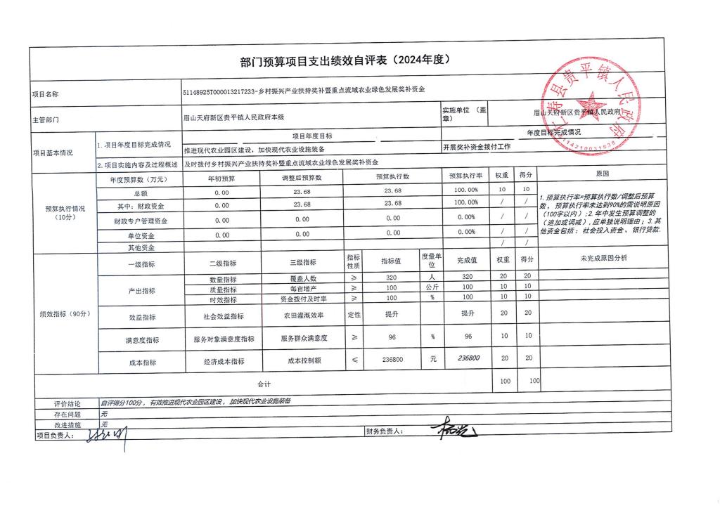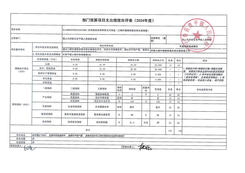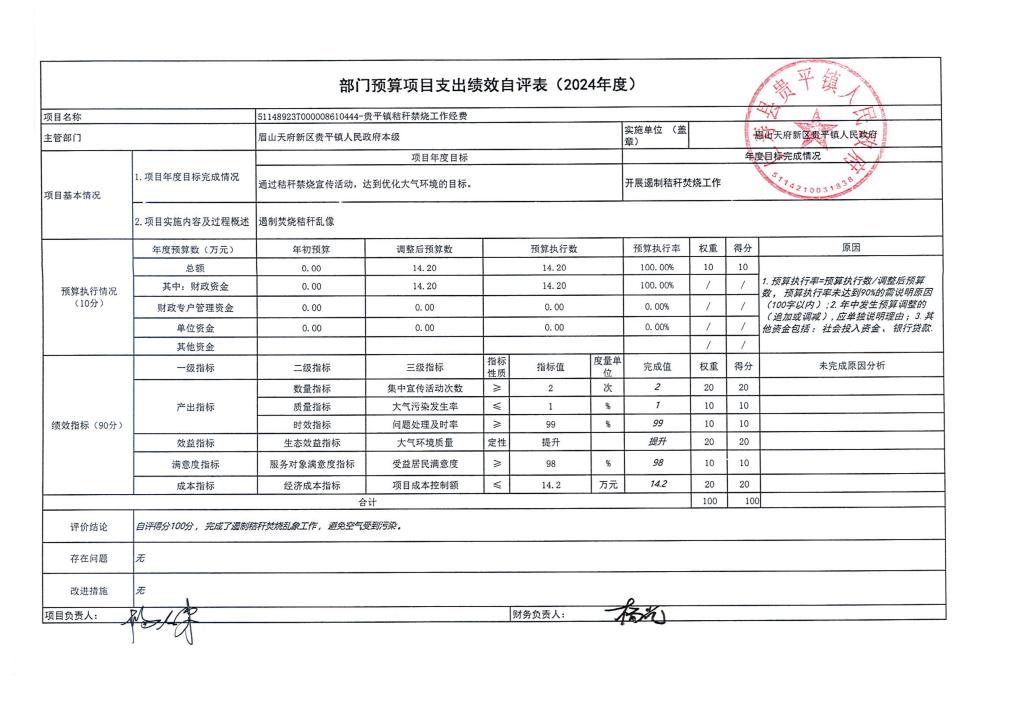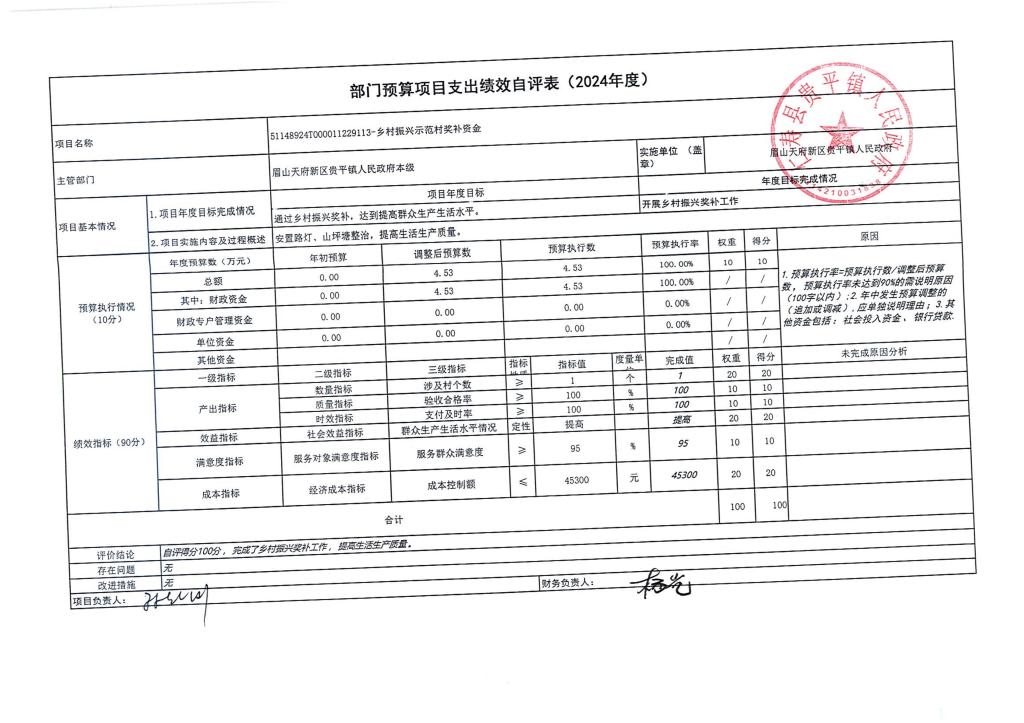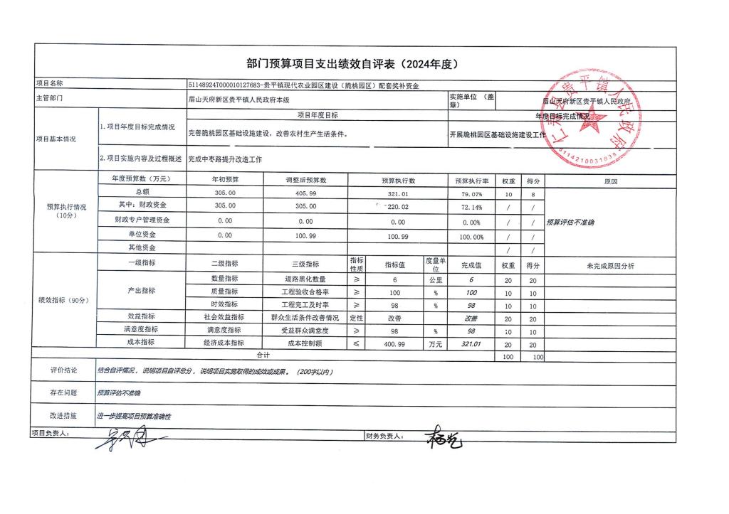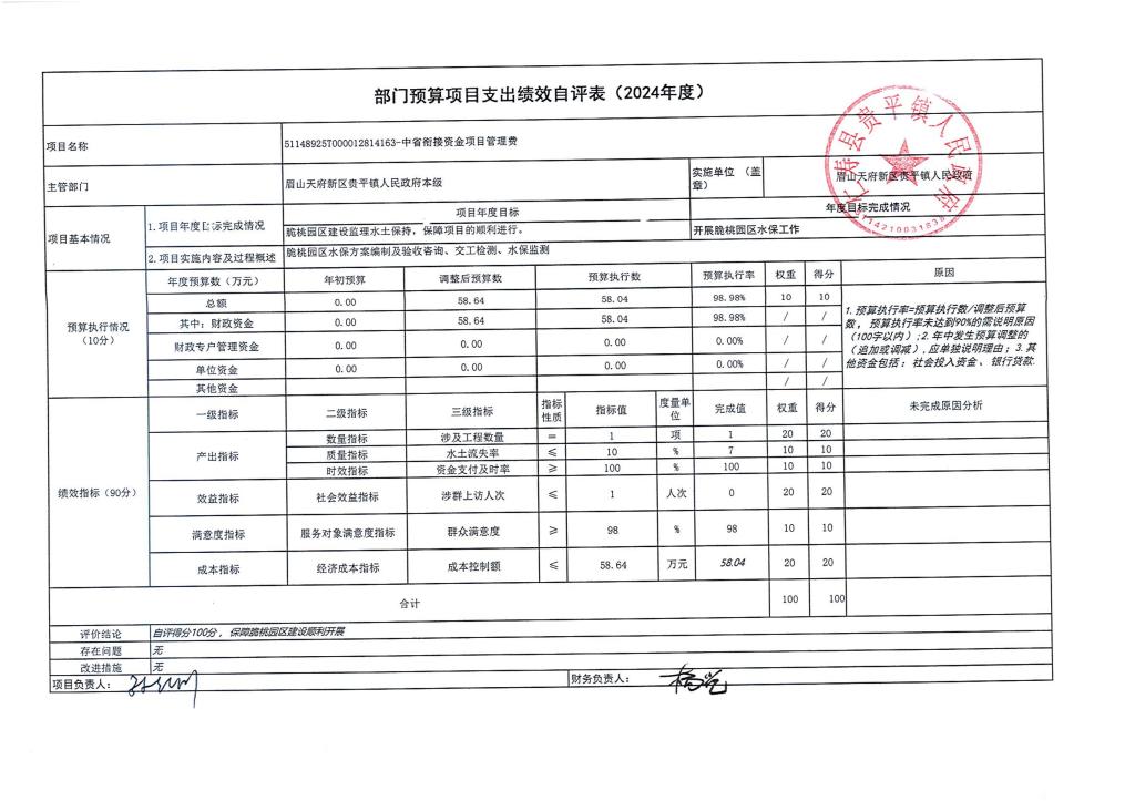 根据预算绩效管理要求,眉山天府新区贵平镇人民政府在2024年度预算编制阶段,组织对“四好农村路”建设资金)、淹没补助-三岔湖和黑龙潭水库淹没区粮食补助、乡村振兴产业扶持奖补暨重点流域农业绿色发展奖补资金、农户户属设施改造项目、民生实事“路灯照明”工程等89个项目开展了预算事前绩效评估,对89个项目编制了绩效目标;预算执行过程中,对89个项目开展绩效监控;年终执行完毕后,组织对89个项目开展绩效自评,形成89个部门预算项目绩效自评表,《部门预算项目支出绩效自评表(2024年度)》见附表十四(第五部分)。