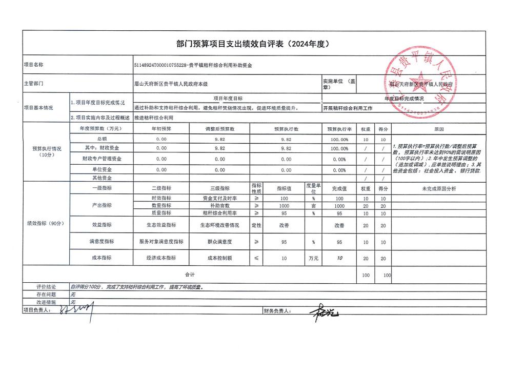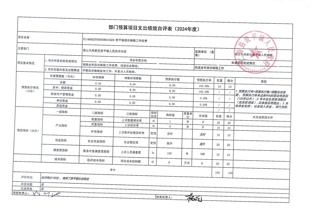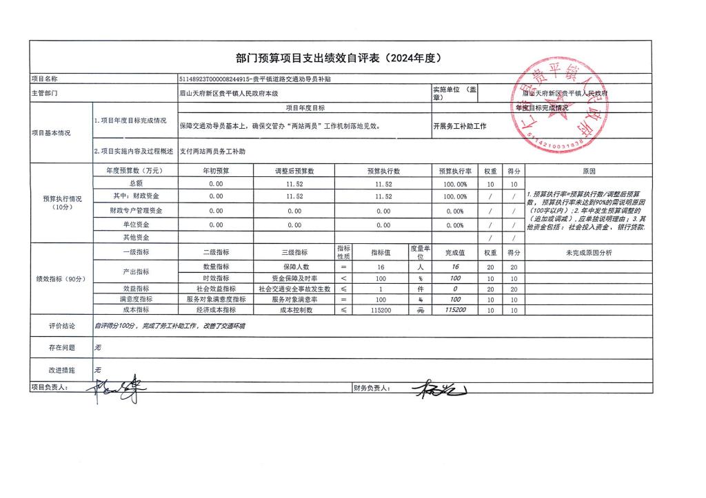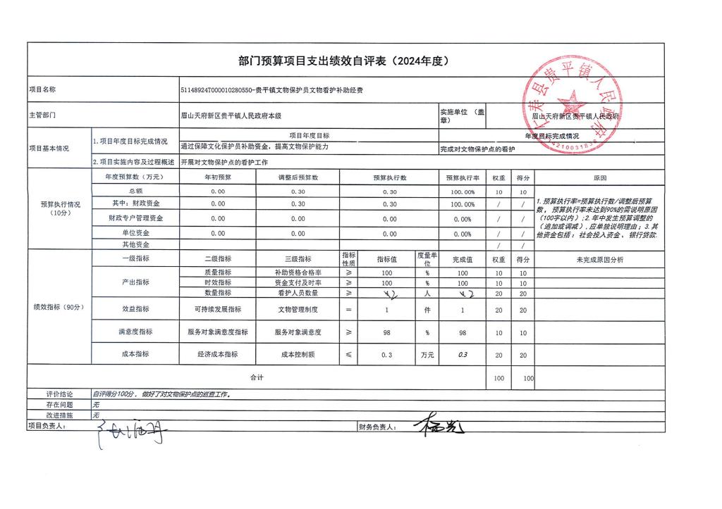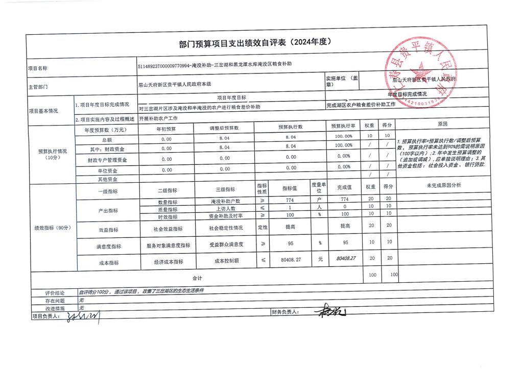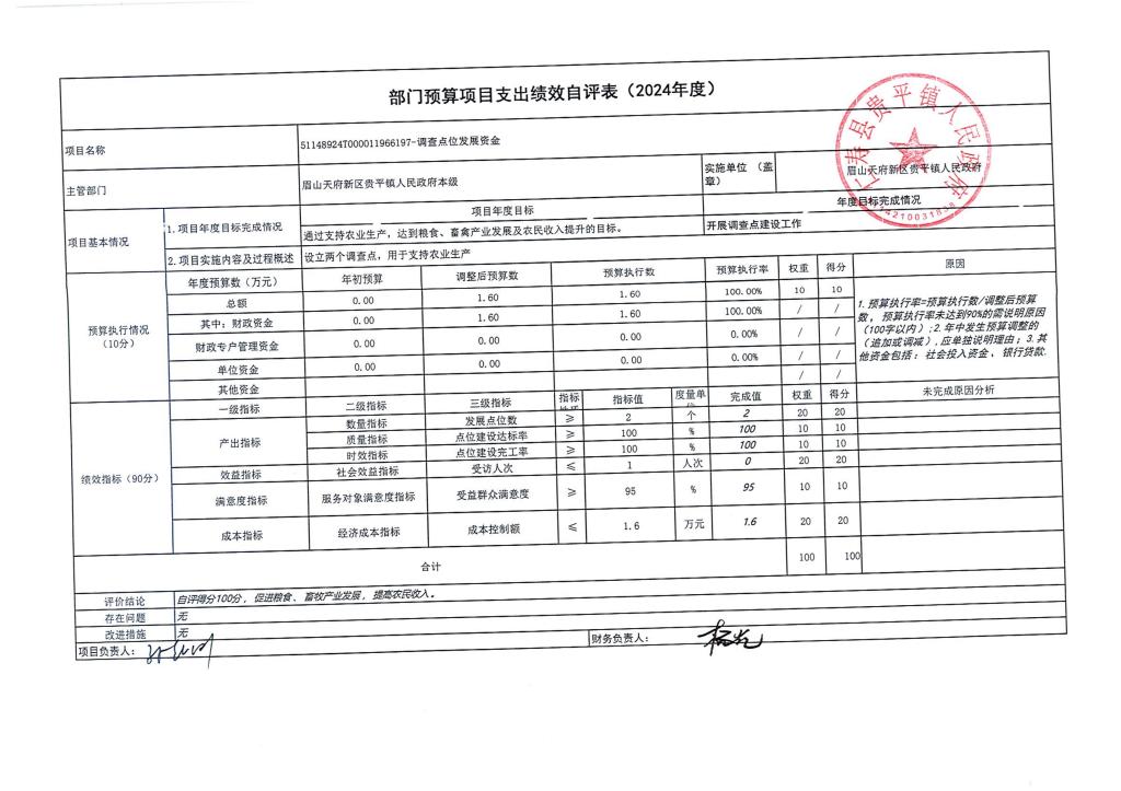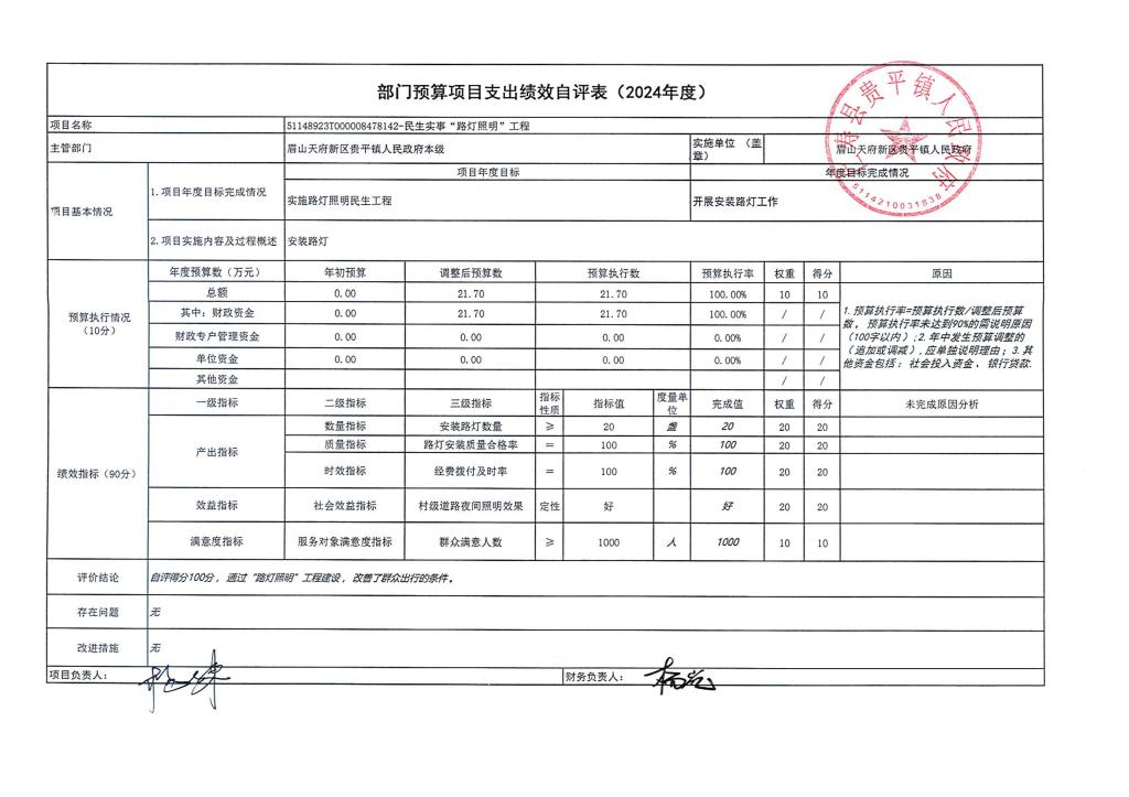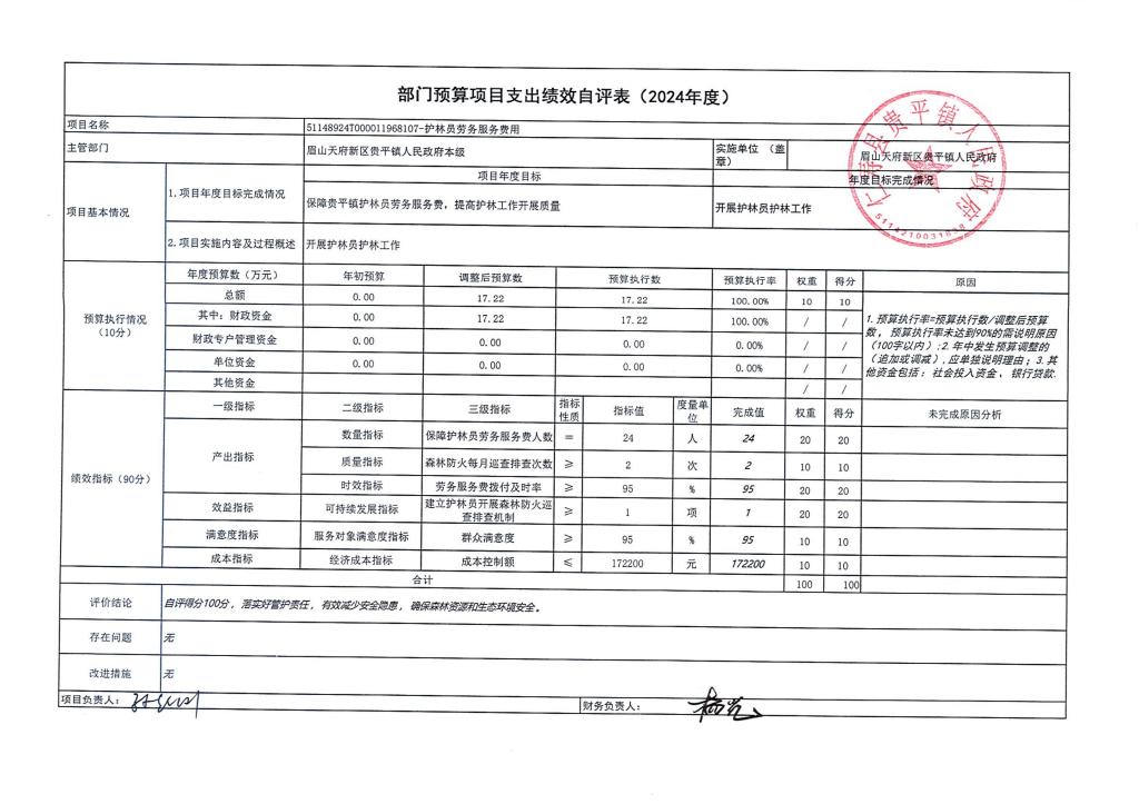 根据预算绩效管理要求,眉山天府新区贵平镇人民政府在2024年度预算编制阶段,组织对“四好农村路”建设资金)、淹没补助-三岔湖和黑龙潭水库淹没区粮食补助、乡村振兴产业扶持奖补暨重点流域农业绿色发展奖补资金、农户户属设施改造项目、民生实事“路灯照明”工程等89个项目开展了预算事前绩效评估,对89个项目编制了绩效目标;预算执行过程中,对89个项目开展绩效监控;年终执行完毕后,组织对89个项目开展绩效自评,形成89个部门预算项目绩效自评表,《部门预算项目支出绩效自评表(2024年度)》见附表十四(第五部分)。