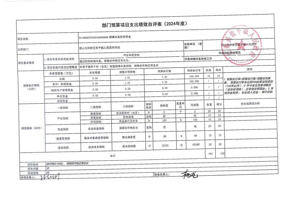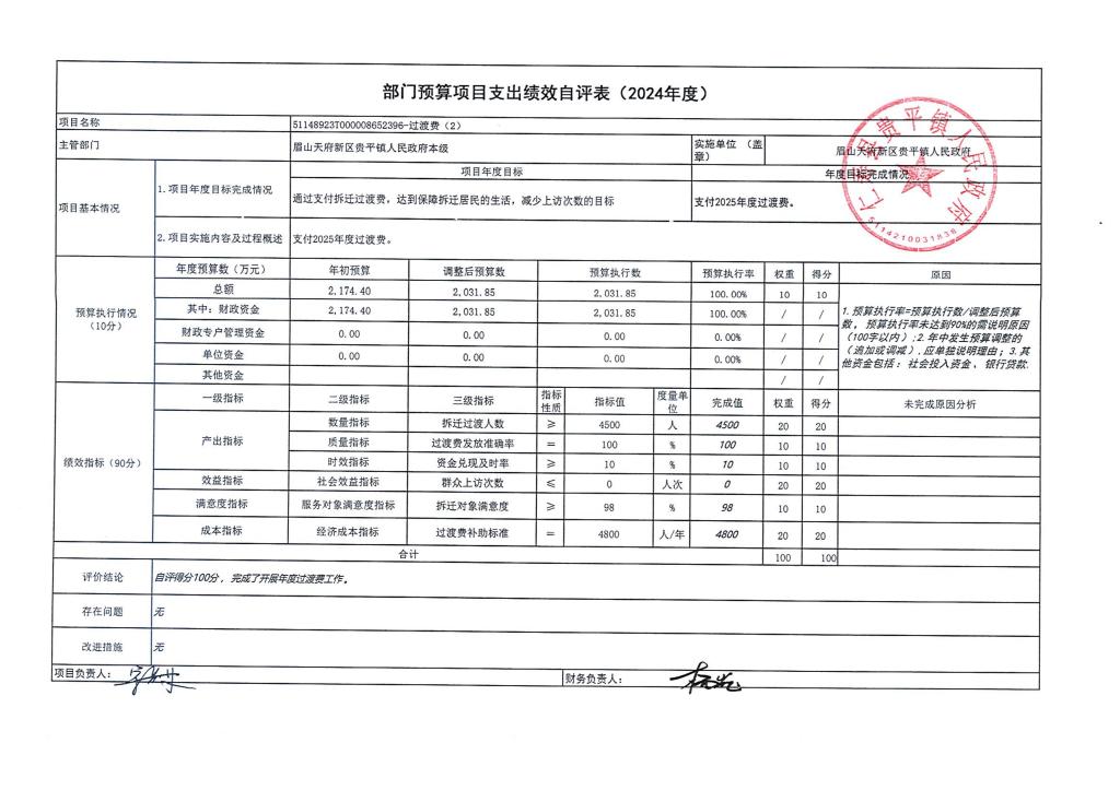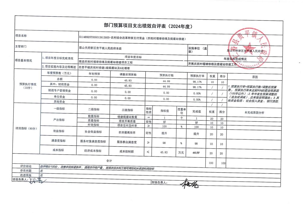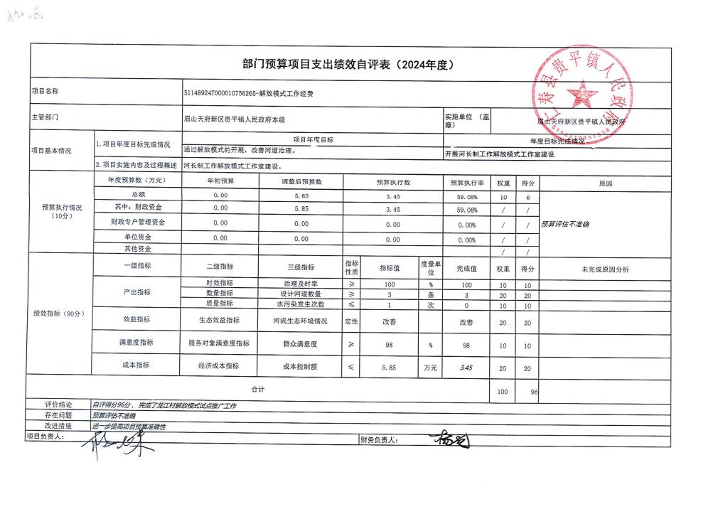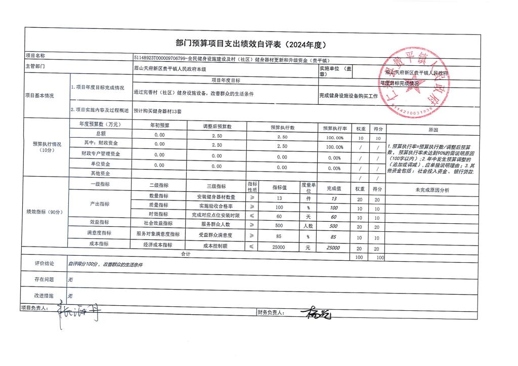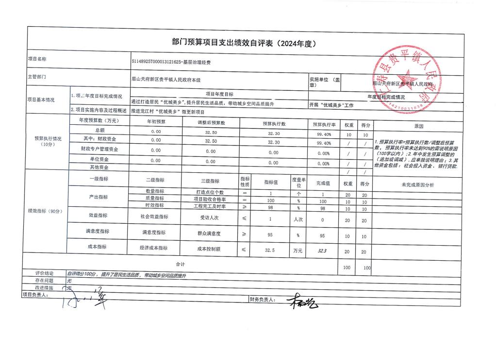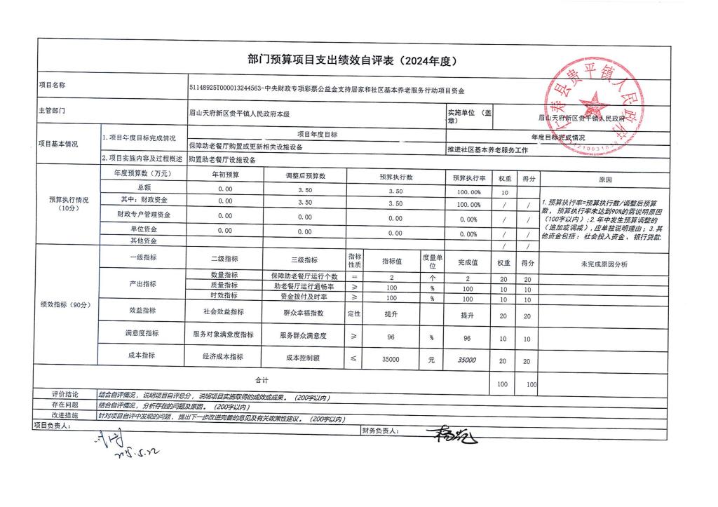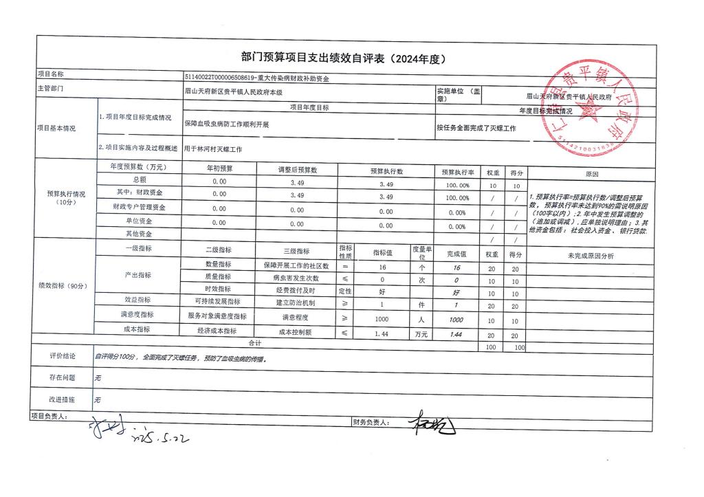 根据预算绩效管理要求,眉山天府新区贵平镇人民政府在2024年度预算编制阶段,组织对“四好农村路”建设资金)、淹没补助-三岔湖和黑龙潭水库淹没区粮食补助、乡村振兴产业扶持奖补暨重点流域农业绿色发展奖补资金、农户户属设施改造项目、民生实事“路灯照明”工程等89个项目开展了预算事前绩效评估,对89个项目编制了绩效目标;预算执行过程中,对89个项目开展绩效监控;年终执行完毕后,组织对89个项目开展绩效自评,形成89个部门预算项目绩效自评表,《部门预算项目支出绩效自评表(2024年度)》见附表十四(第五部分)。