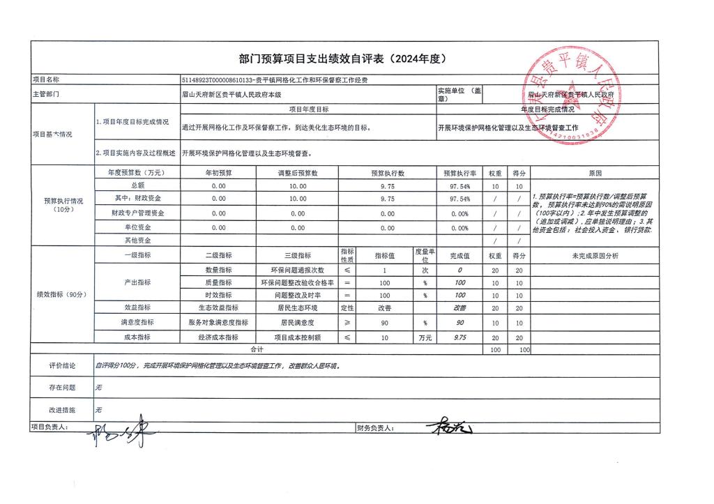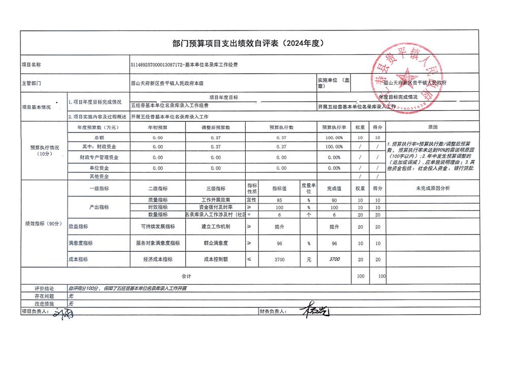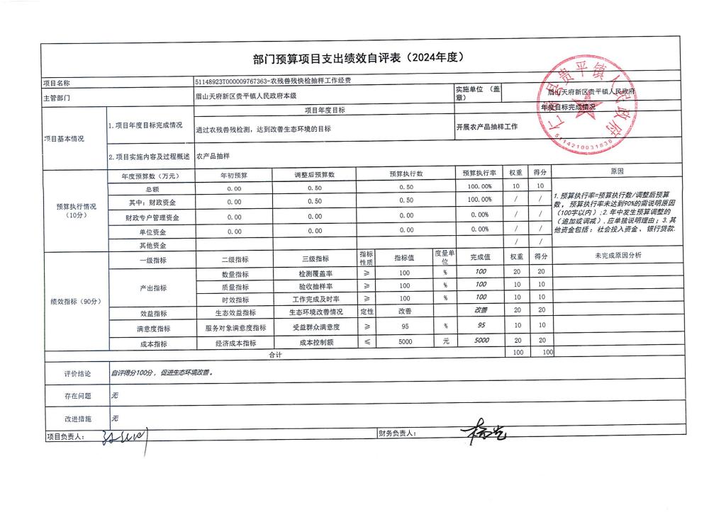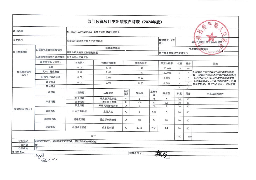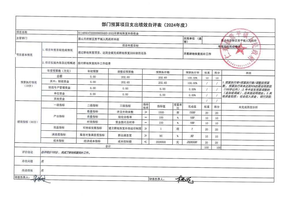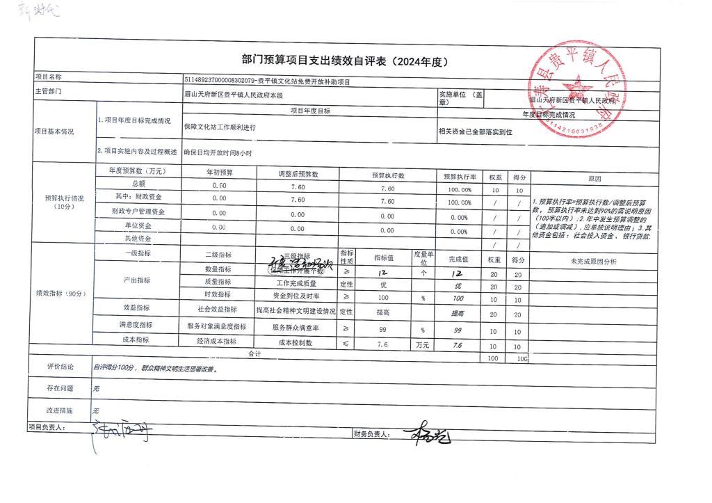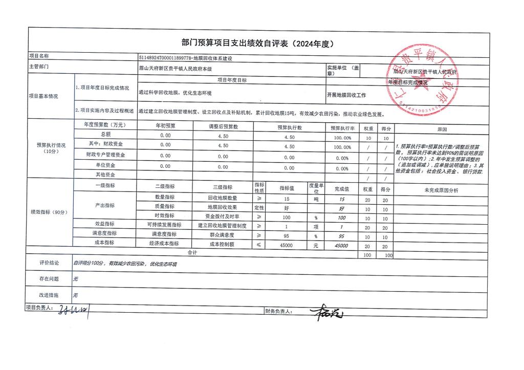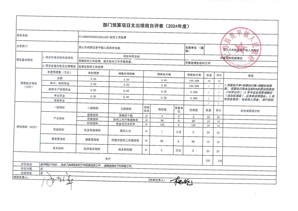 根据预算绩效管理要求,眉山天府新区贵平镇人民政府在2024年度预算编制阶段,组织对“四好农村路”建设资金)、淹没补助-三岔湖和黑龙潭水库淹没区粮食补助、乡村振兴产业扶持奖补暨重点流域农业绿色发展奖补资金、农户户属设施改造项目、民生实事“路灯照明”工程等89个项目开展了预算事前绩效评估,对89个项目编制了绩效目标;预算执行过程中,对89个项目开展绩效监控;年终执行完毕后,组织对89个项目开展绩效自评,形成89个部门预算项目绩效自评表,《部门预算项目支出绩效自评表(2024年度)》见附表十四(第五部分)。