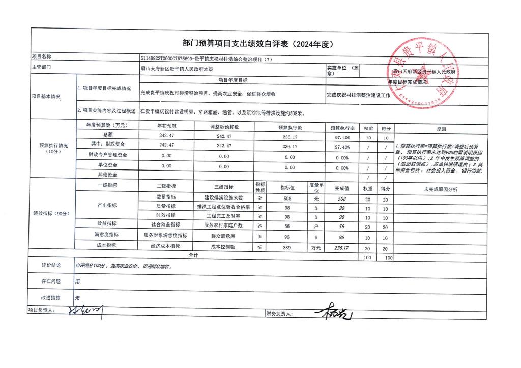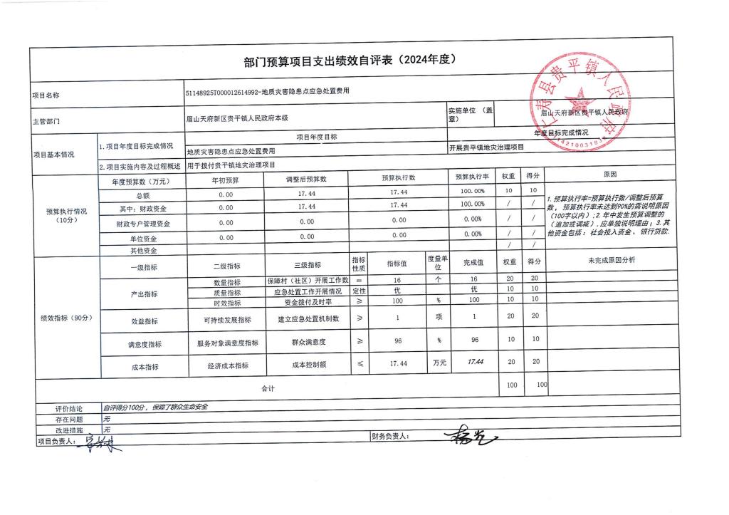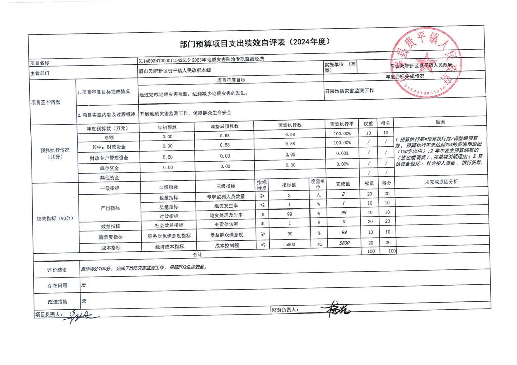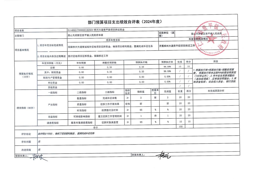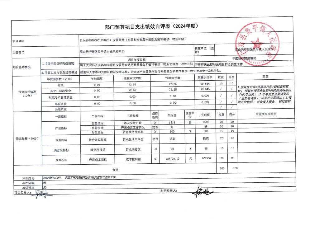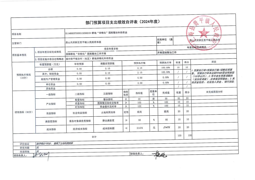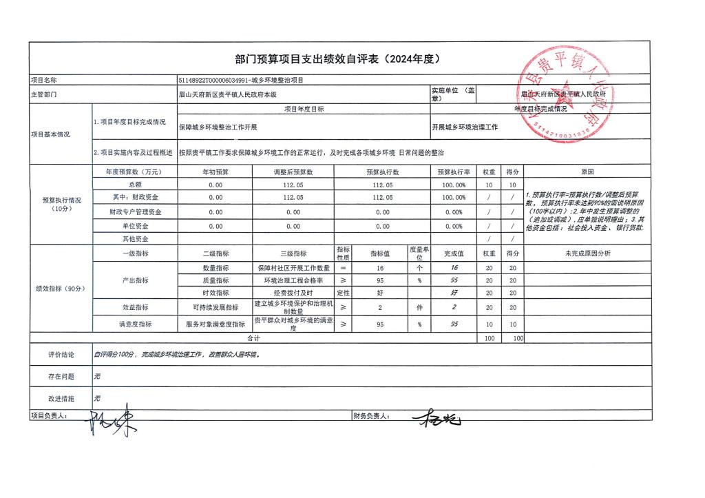 根据预算绩效管理要求,眉山天府新区贵平镇人民政府在2024年度预算编制阶段,组织对“四好农村路”建设资金)、淹没补助-三岔湖和黑龙潭水库淹没区粮食补助、乡村振兴产业扶持奖补暨重点流域农业绿色发展奖补资金、农户户属设施改造项目、民生实事“路灯照明”工程等89个项目开展了预算事前绩效评估,对89个项目编制了绩效目标;预算执行过程中,对89个项目开展绩效监控;年终执行完毕后,组织对89个项目开展绩效自评,形成89个部门预算项目绩效自评表,《部门预算项目支出绩效自评表(2024年度)》见附表十四(第五部分)。