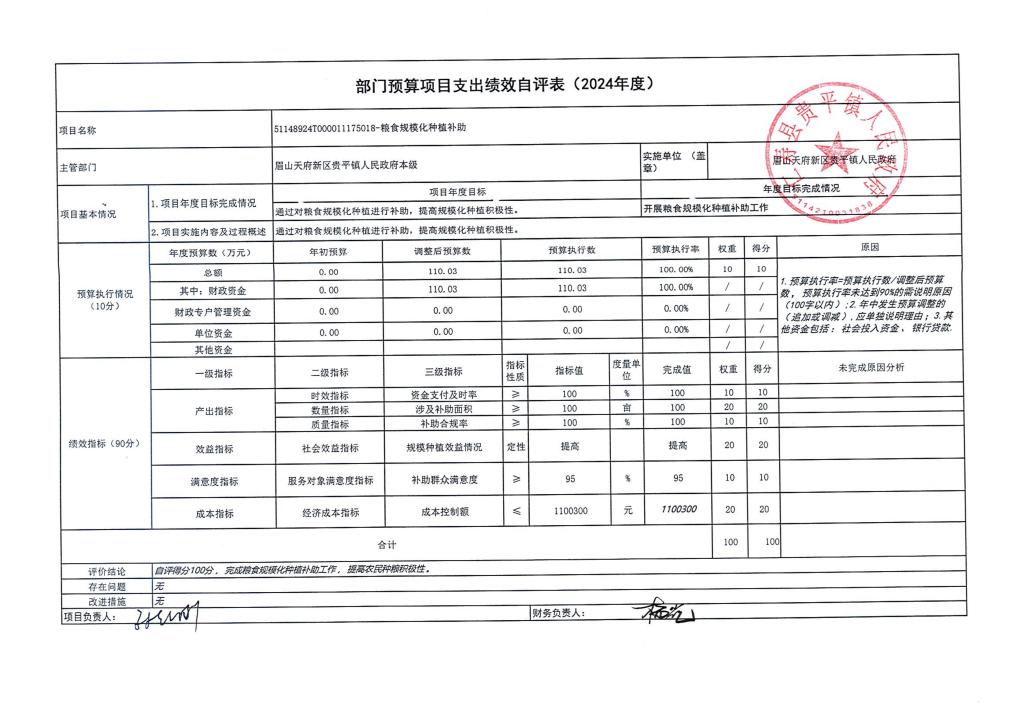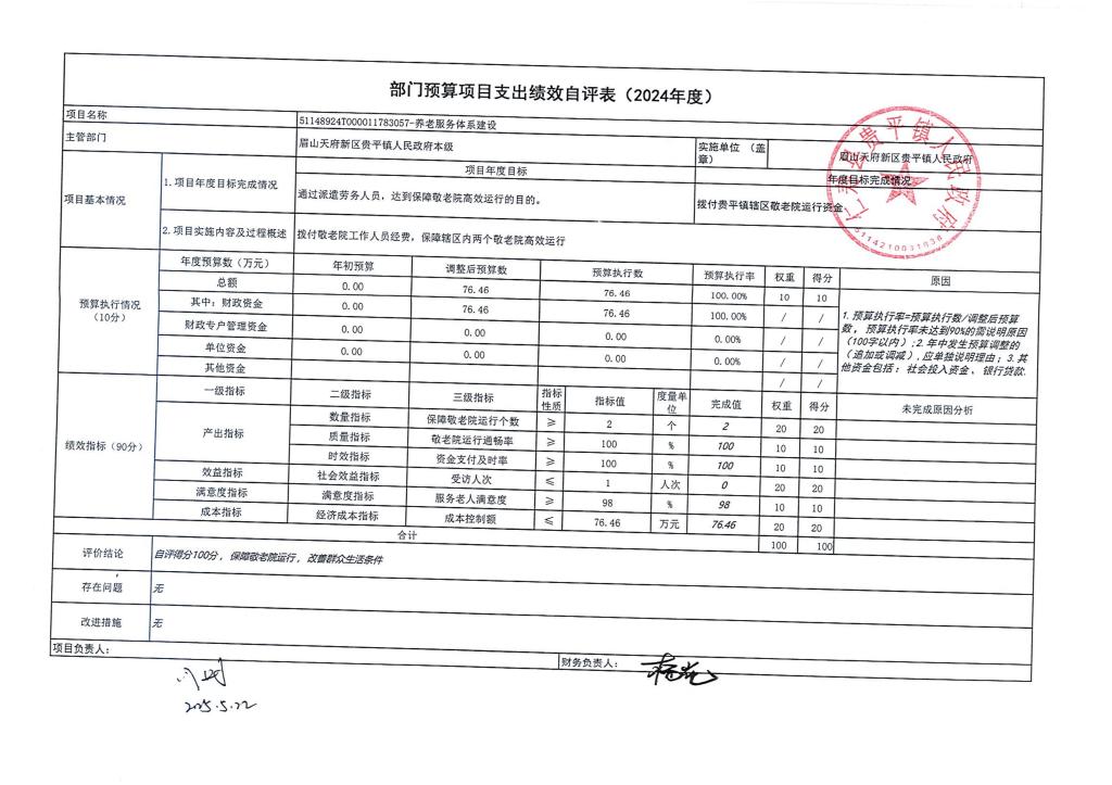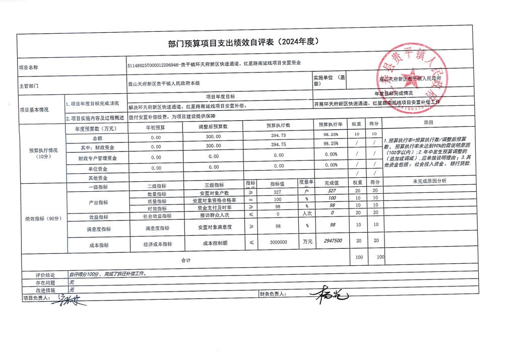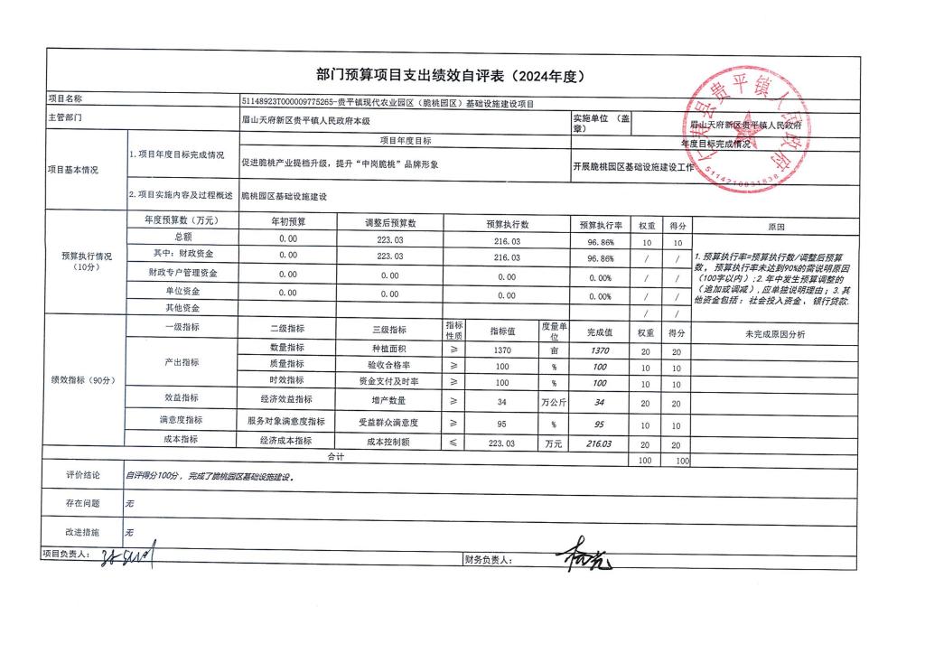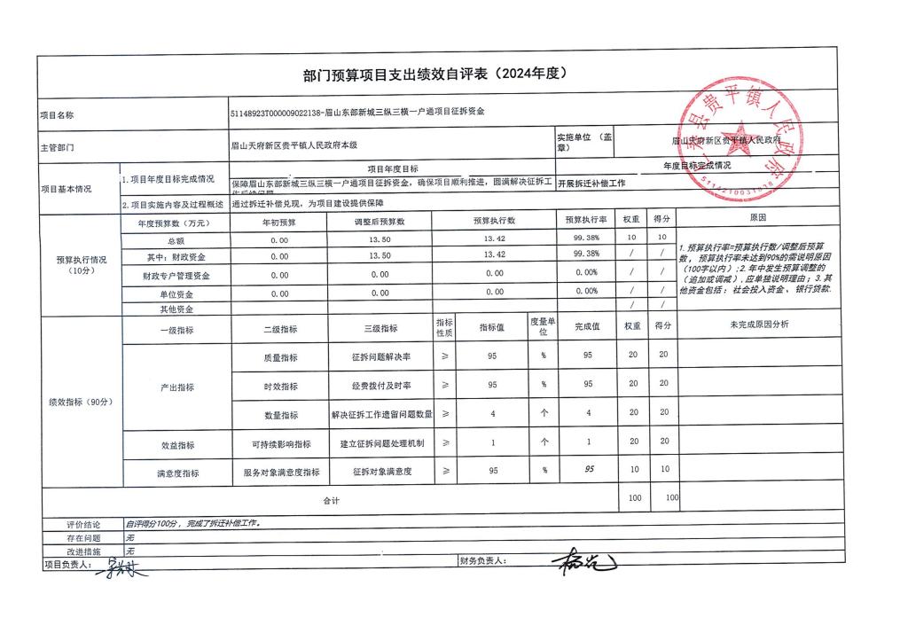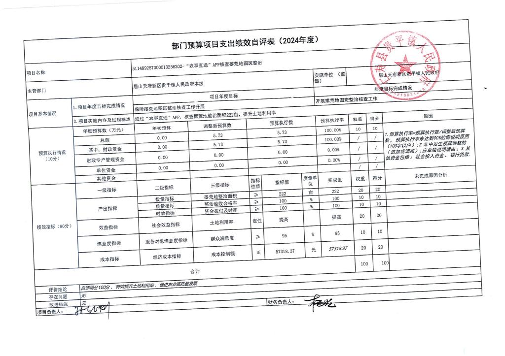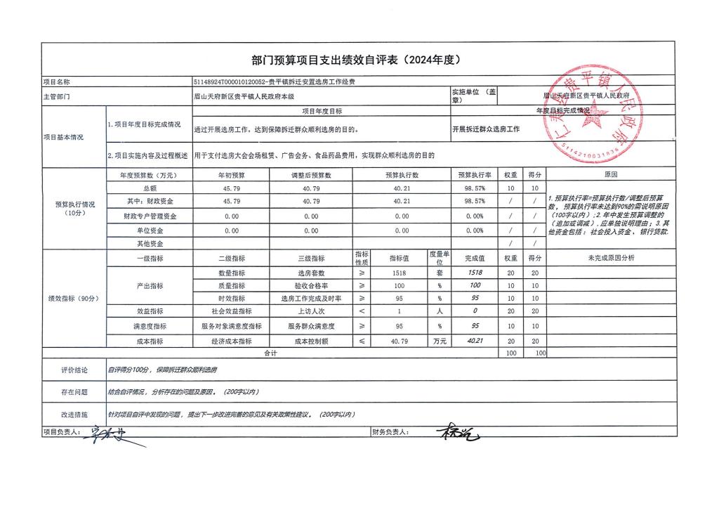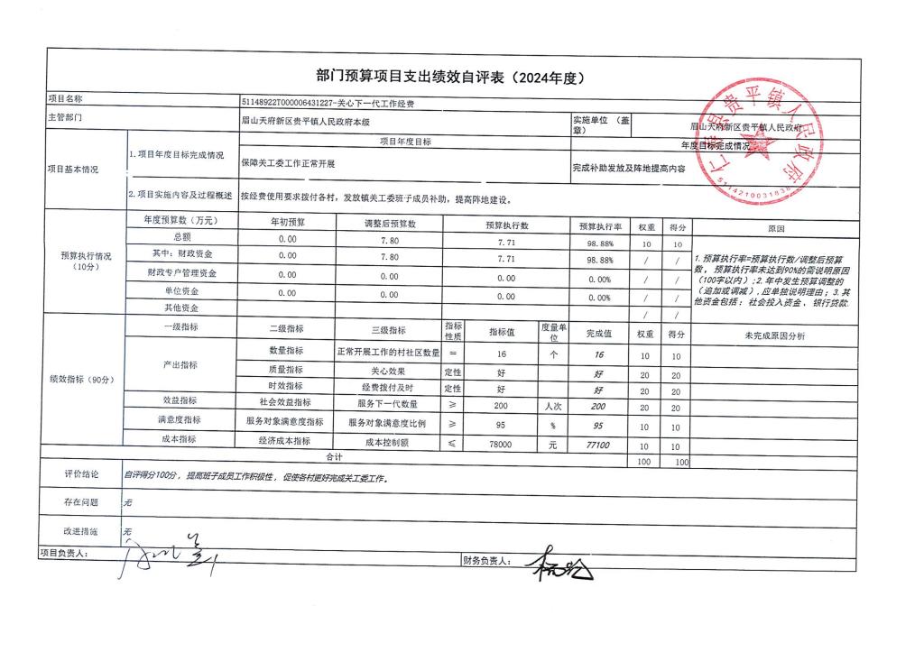 根据预算绩效管理要求,眉山天府新区贵平镇人民政府在2024年度预算编制阶段,组织对“四好农村路”建设资金)、淹没补助-三岔湖和黑龙潭水库淹没区粮食补助、乡村振兴产业扶持奖补暨重点流域农业绿色发展奖补资金、农户户属设施改造项目、民生实事“路灯照明”工程等89个项目开展了预算事前绩效评估,对89个项目编制了绩效目标;预算执行过程中,对89个项目开展绩效监控;年终执行完毕后,组织对89个项目开展绩效自评,形成89个部门预算项目绩效自评表,《部门预算项目支出绩效自评表(2024年度)》见附表十四(第五部分)。