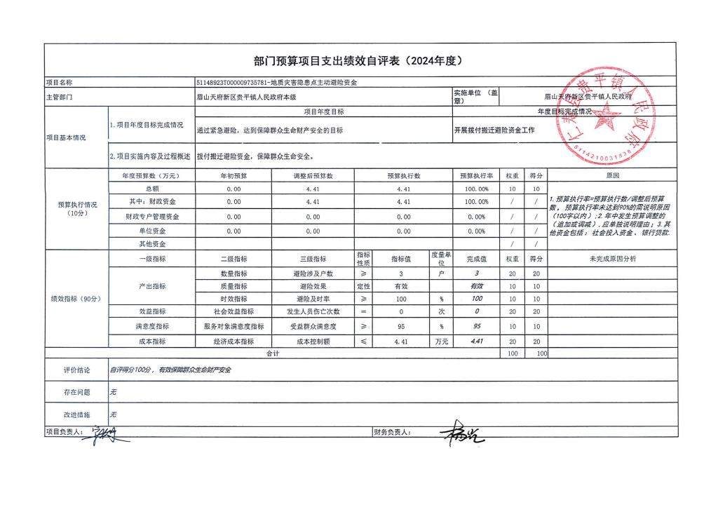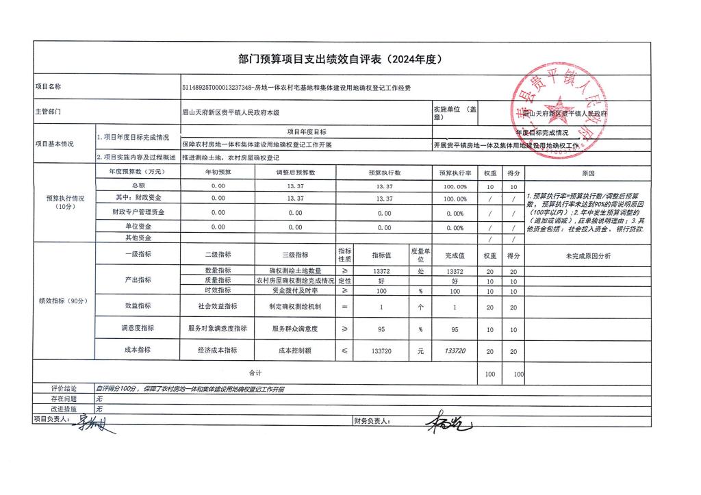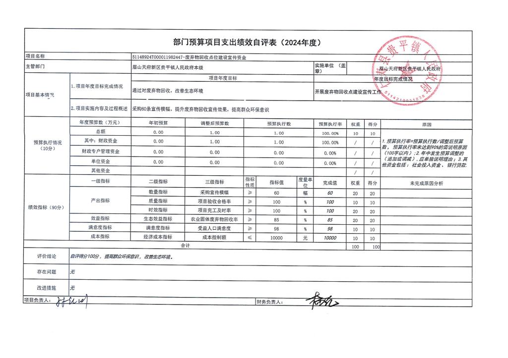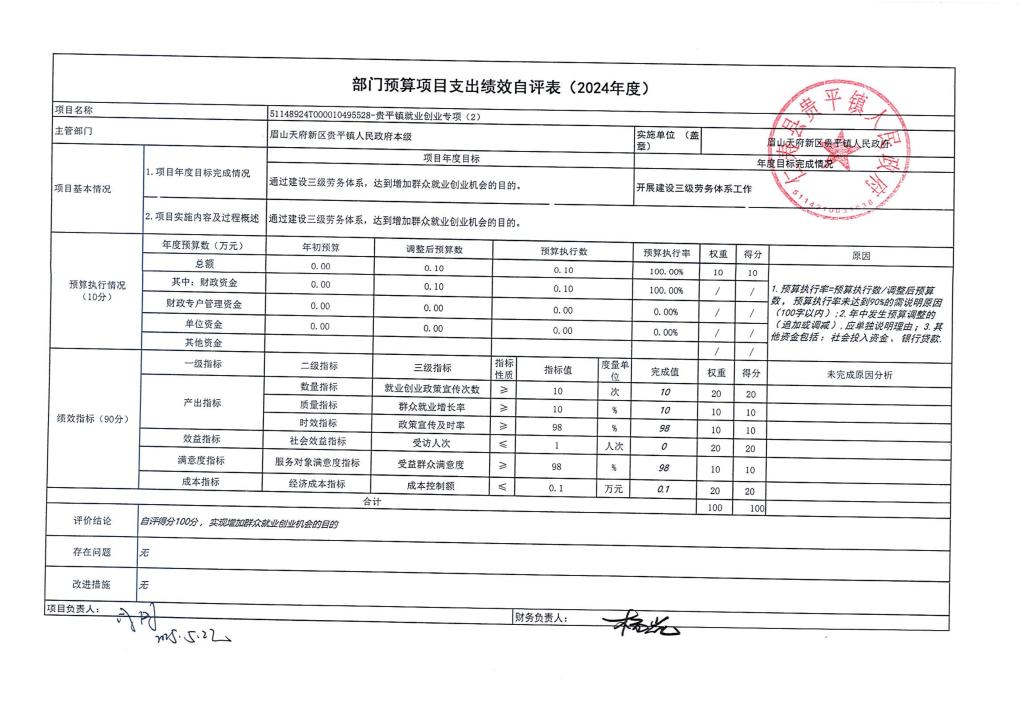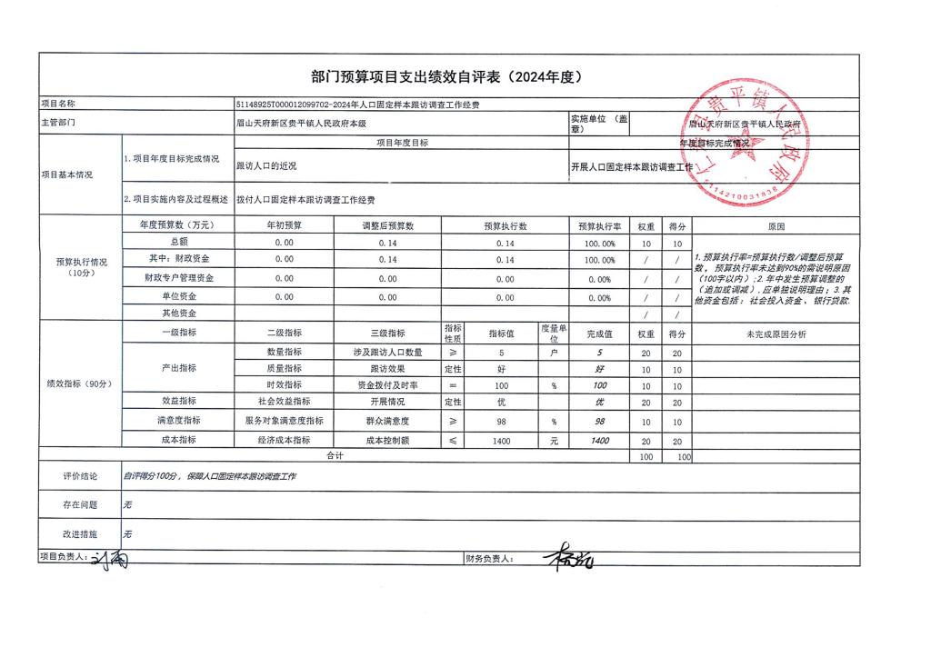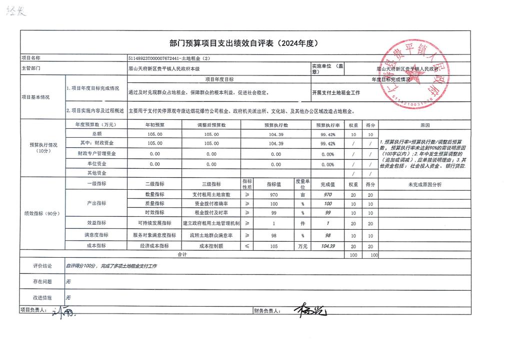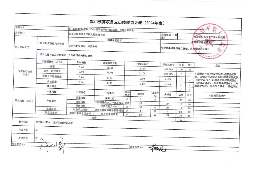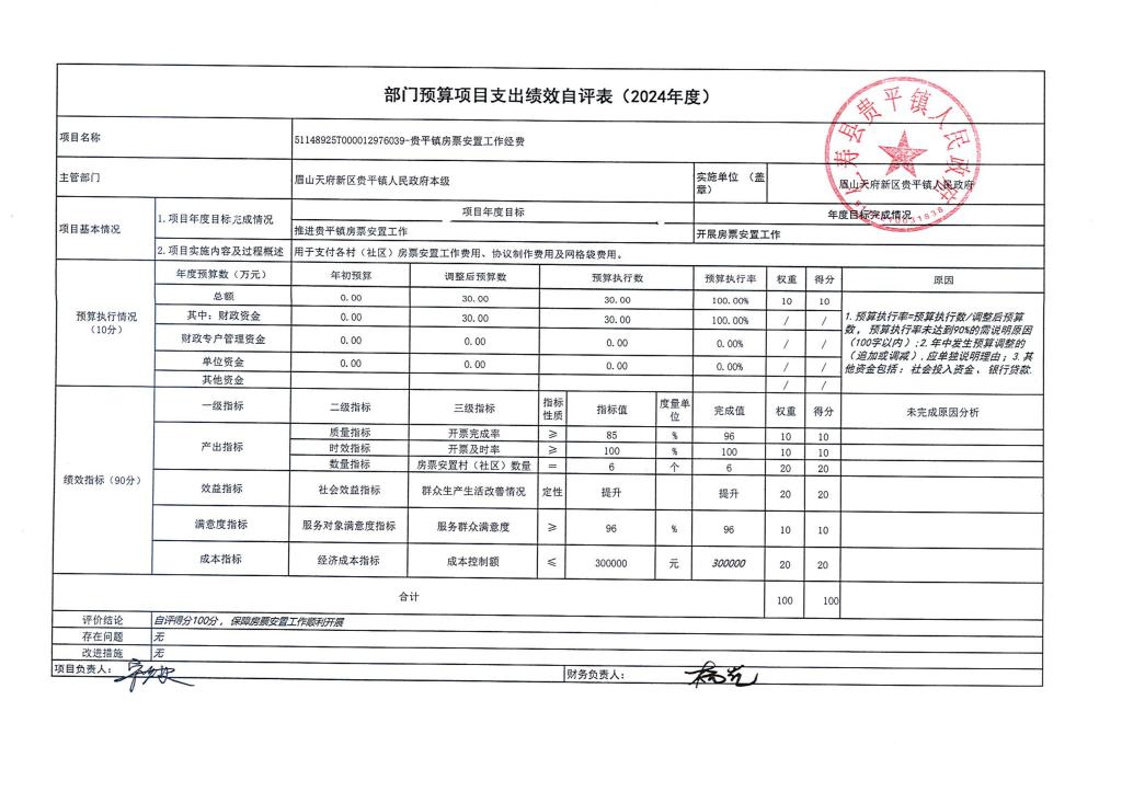 根据预算绩效管理要求,眉山天府新区贵平镇人民政府在2024年度预算编制阶段,组织对“四好农村路”建设资金)、淹没补助-三岔湖和黑龙潭水库淹没区粮食补助、乡村振兴产业扶持奖补暨重点流域农业绿色发展奖补资金、农户户属设施改造项目、民生实事“路灯照明”工程等89个项目开展了预算事前绩效评估,对89个项目编制了绩效目标;预算执行过程中,对89个项目开展绩效监控;年终执行完毕后,组织对89个项目开展绩效自评,形成89个部门预算项目绩效自评表,《部门预算项目支出绩效自评表(2024年度)》见附表十四(第五部分)。