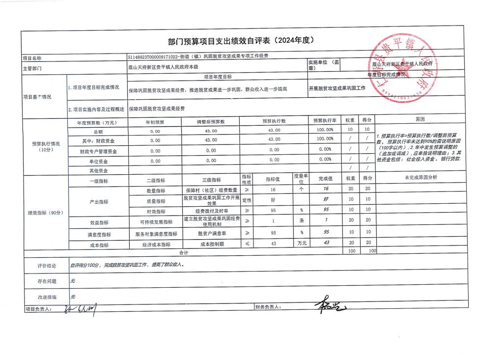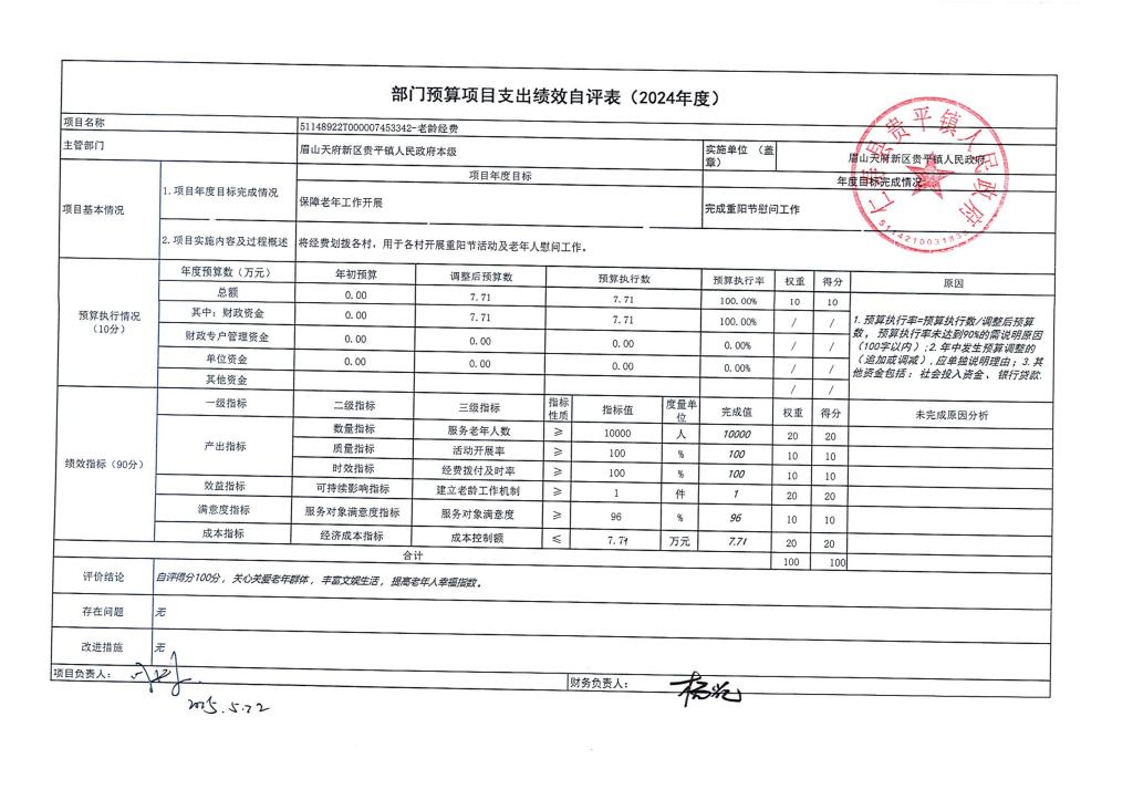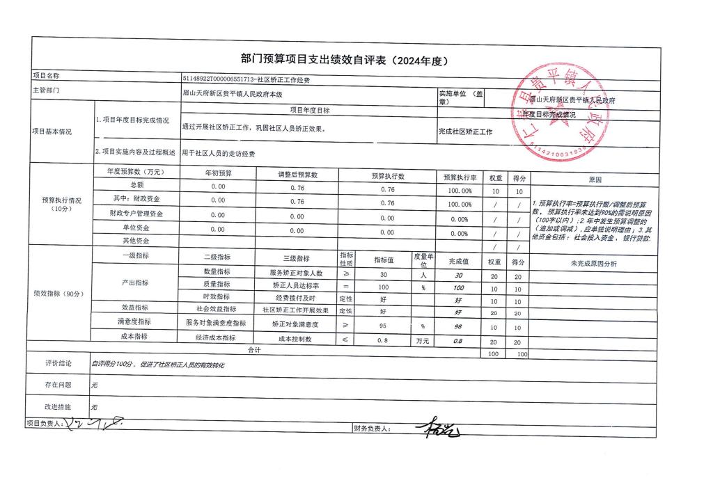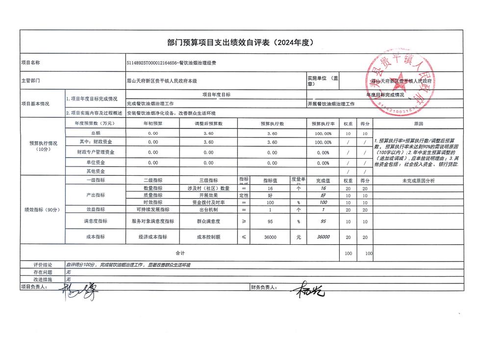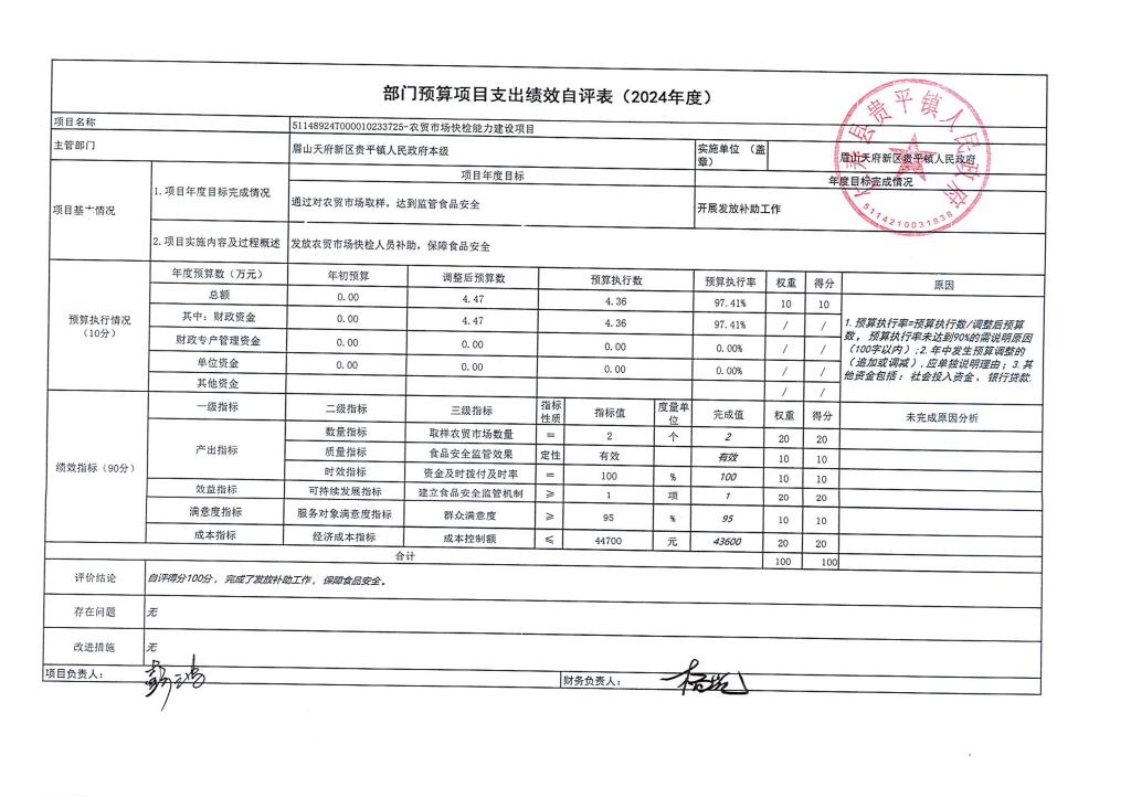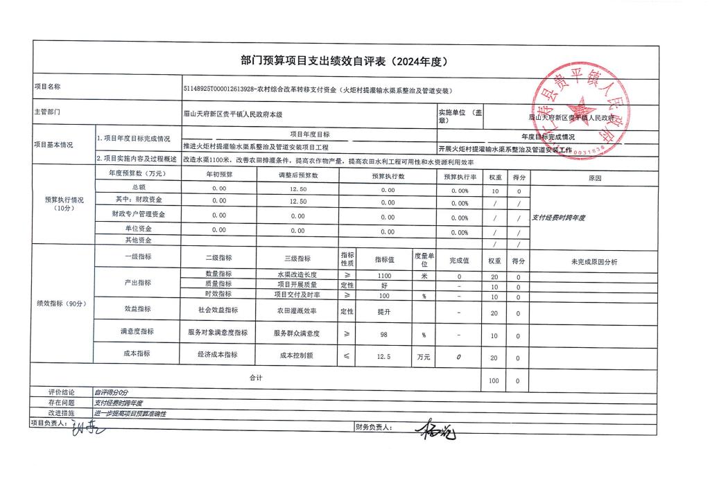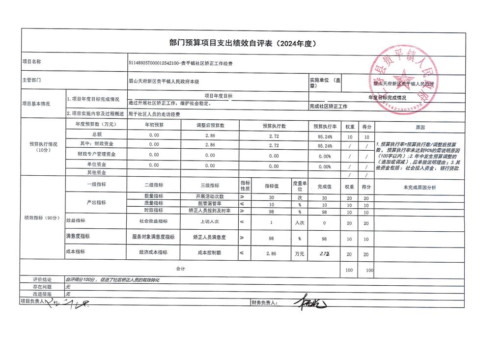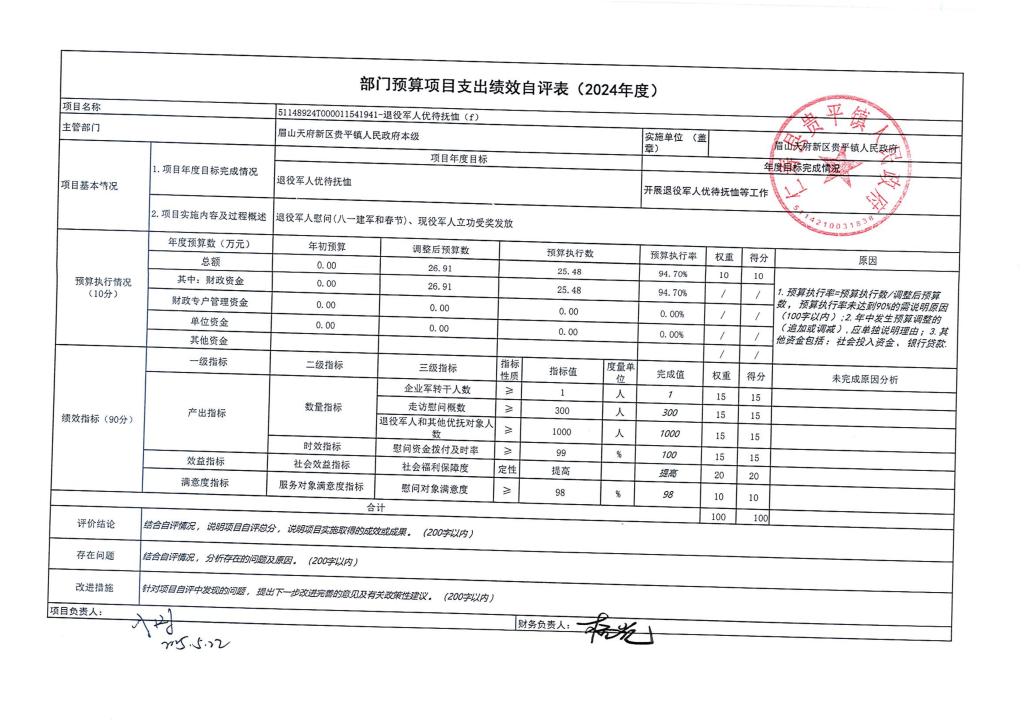 根据预算绩效管理要求,眉山天府新区贵平镇人民政府在2024年度预算编制阶段,组织对“四好农村路”建设资金)、淹没补助-三岔湖和黑龙潭水库淹没区粮食补助、乡村振兴产业扶持奖补暨重点流域农业绿色发展奖补资金、农户户属设施改造项目、民生实事“路灯照明”工程等89个项目开展了预算事前绩效评估,对89个项目编制了绩效目标;预算执行过程中,对89个项目开展绩效监控;年终执行完毕后,组织对89个项目开展绩效自评,形成89个部门预算项目绩效自评表,《部门预算项目支出绩效自评表(2024年度)》见附表十四(第五部分)。