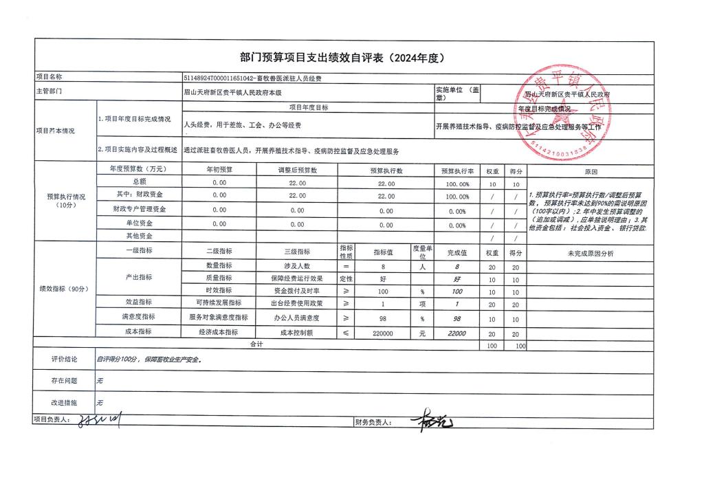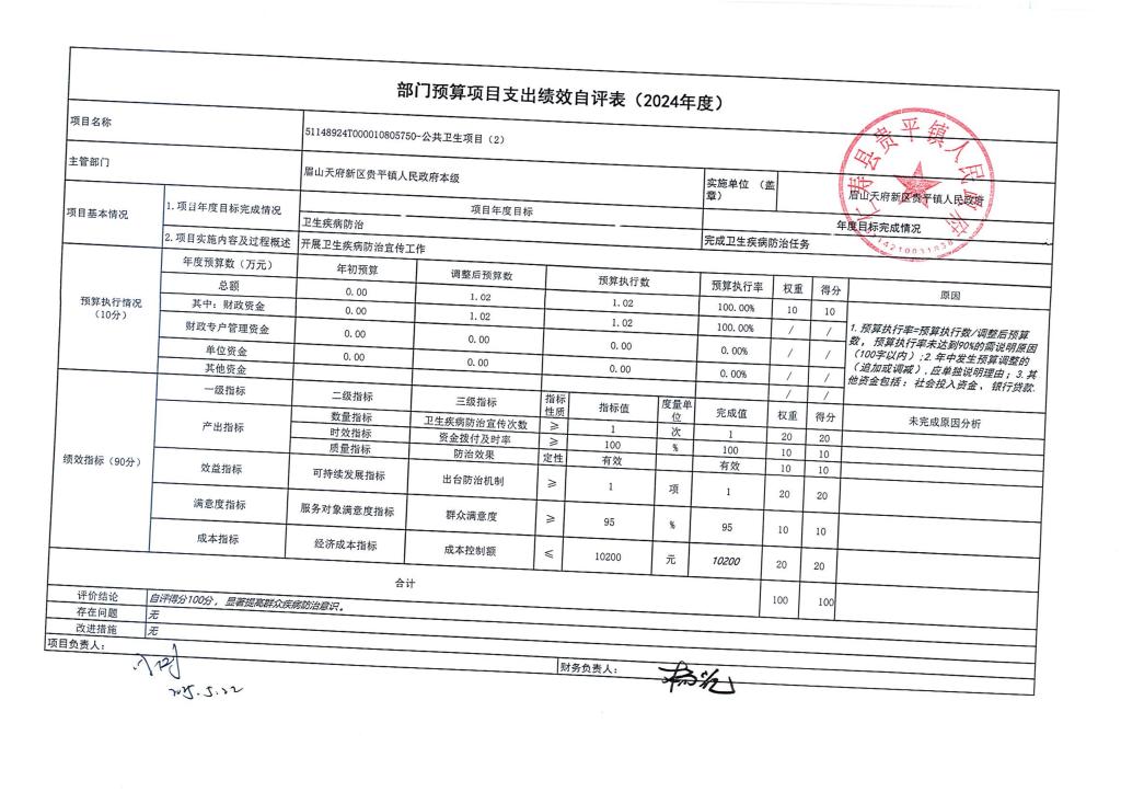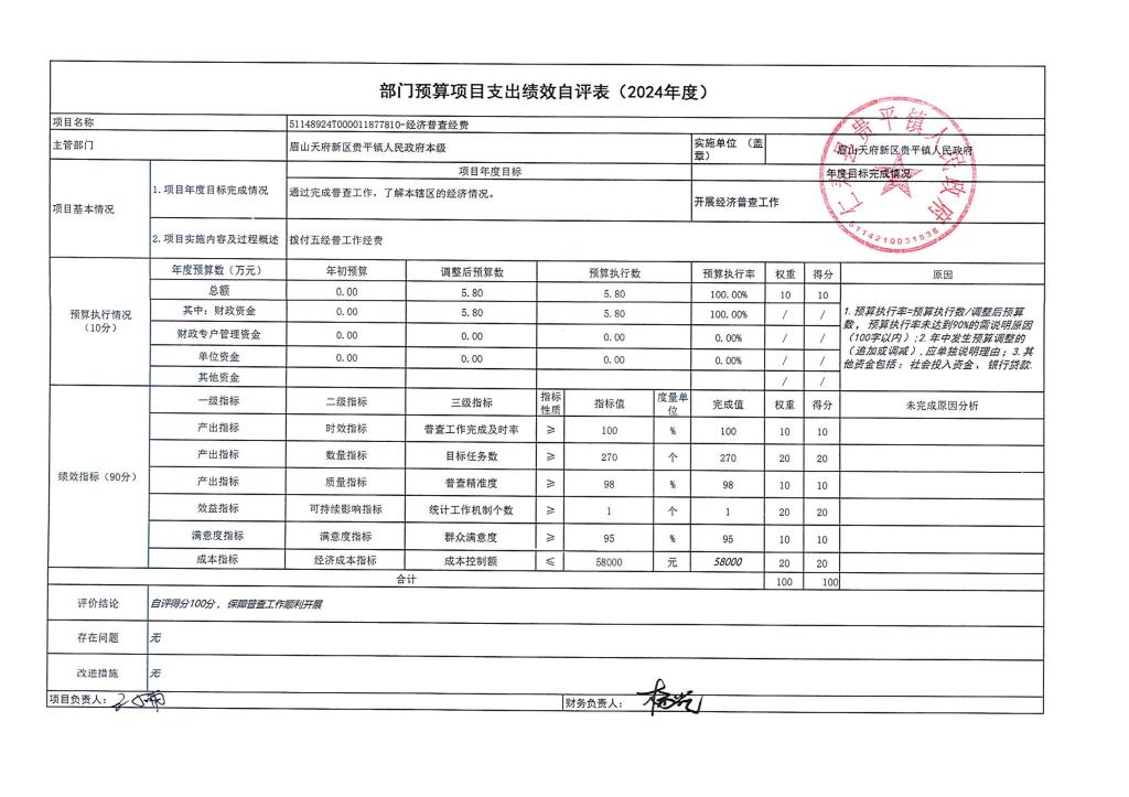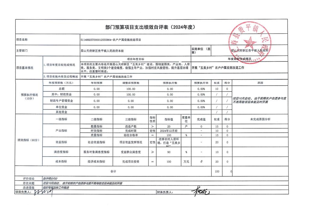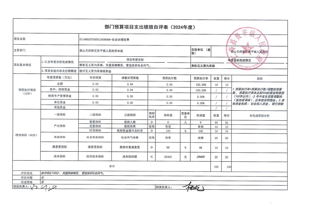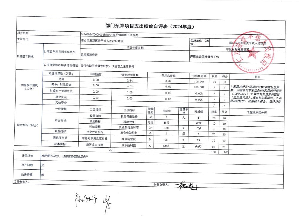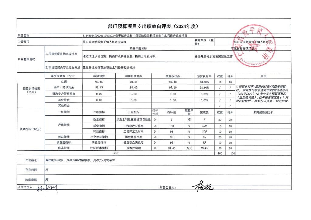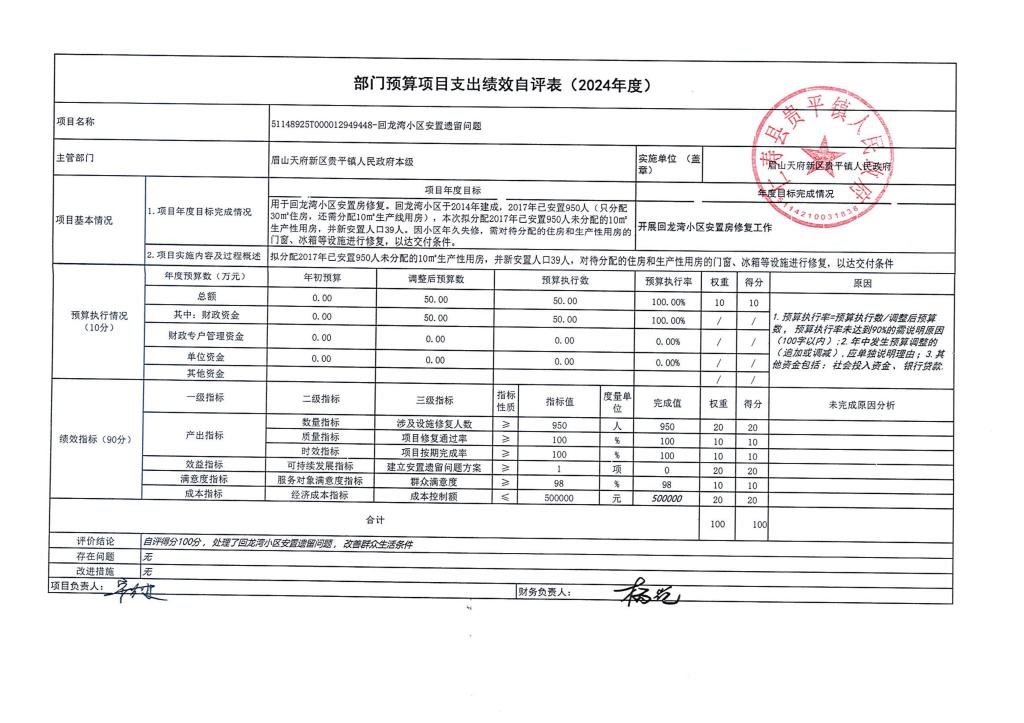 根据预算绩效管理要求,眉山天府新区贵平镇人民政府在2024年度预算编制阶段,组织对“四好农村路”建设资金)、淹没补助-三岔湖和黑龙潭水库淹没区粮食补助、乡村振兴产业扶持奖补暨重点流域农业绿色发展奖补资金、农户户属设施改造项目、民生实事“路灯照明”工程等89个项目开展了预算事前绩效评估,对89个项目编制了绩效目标;预算执行过程中,对89个项目开展绩效监控;年终执行完毕后,组织对89个项目开展绩效自评,形成89个部门预算项目绩效自评表,《部门预算项目支出绩效自评表(2024年度)》见附表十四(第五部分)。