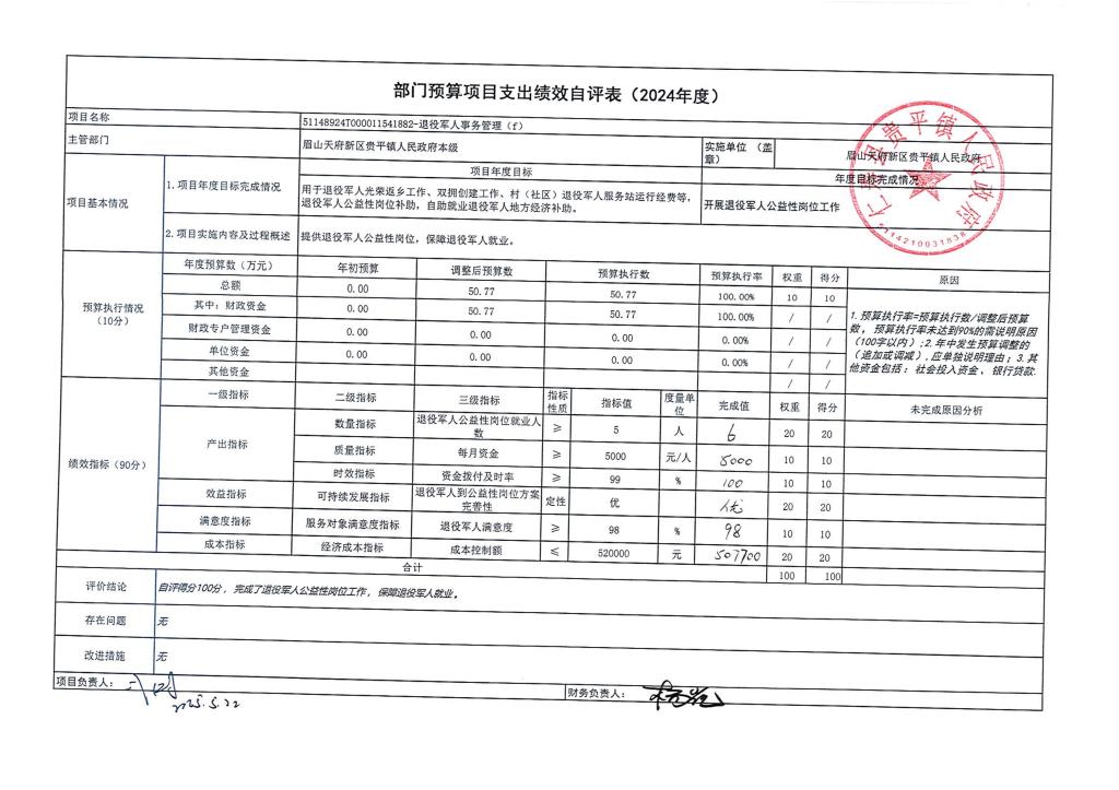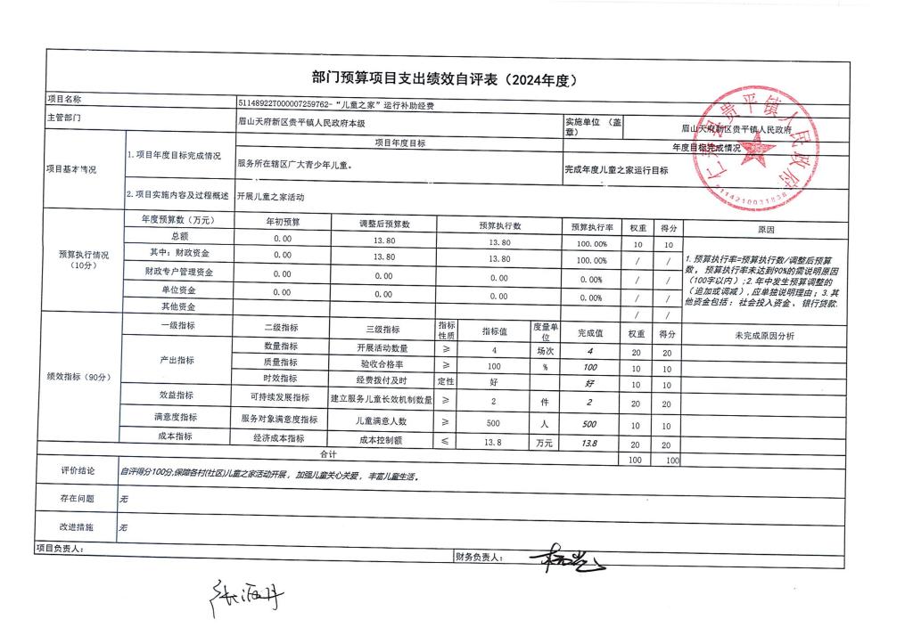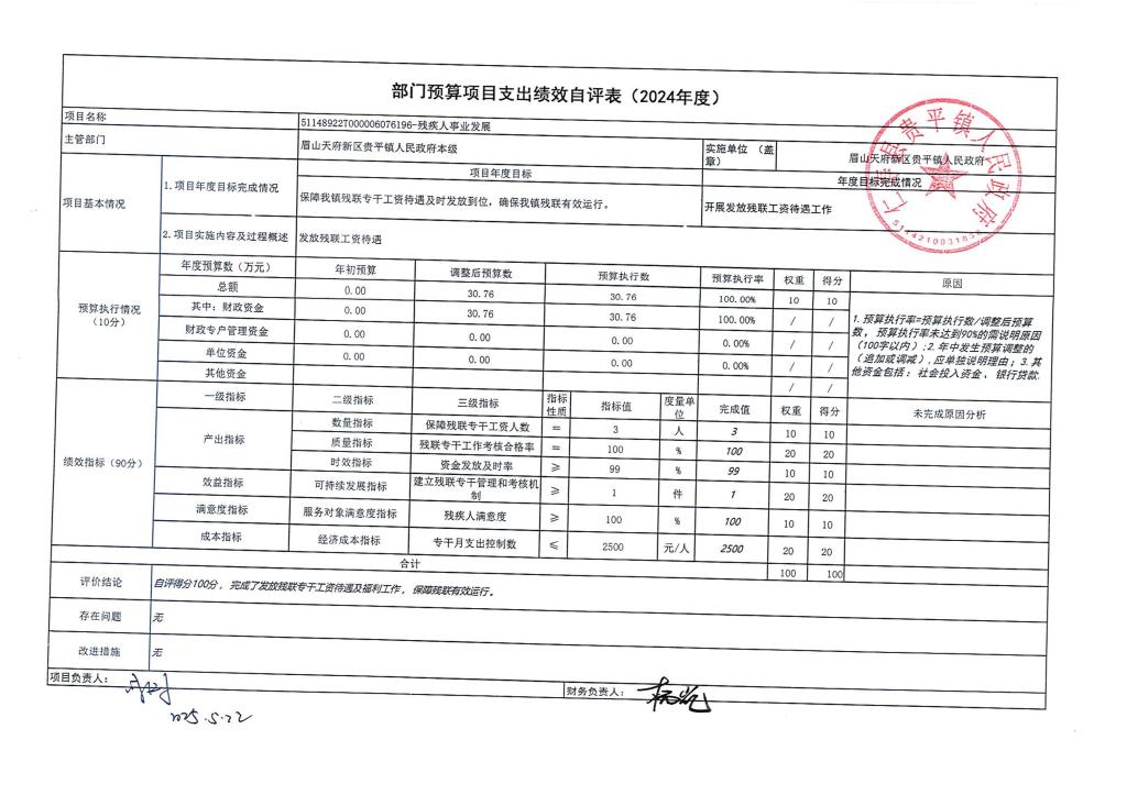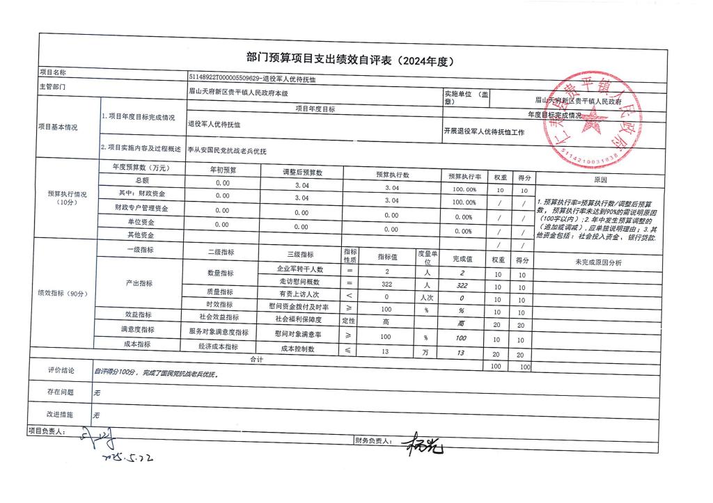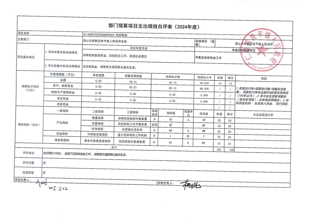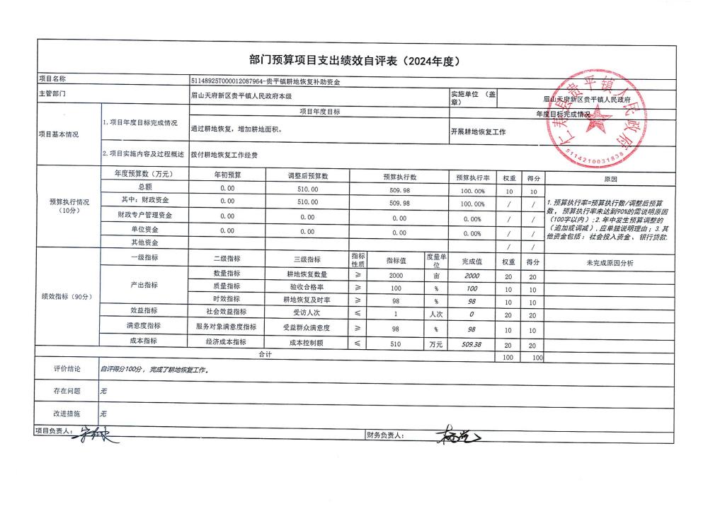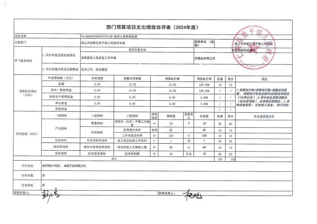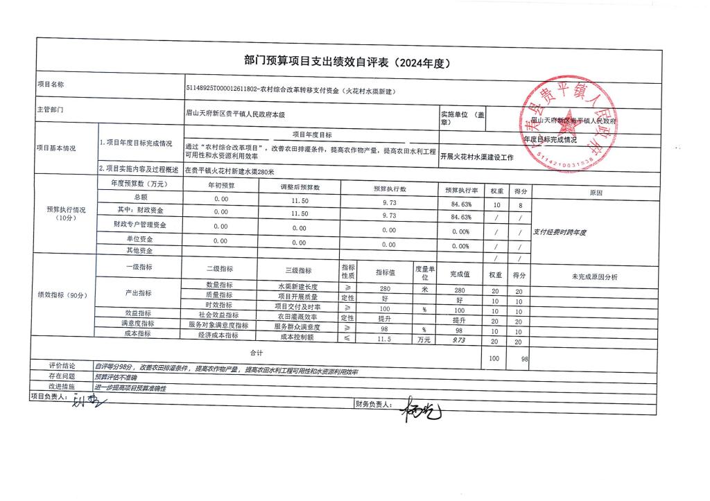 根据预算绩效管理要求,眉山天府新区贵平镇人民政府在2024年度预算编制阶段,组织对“四好农村路”建设资金)、淹没补助-三岔湖和黑龙潭水库淹没区粮食补助、乡村振兴产业扶持奖补暨重点流域农业绿色发展奖补资金、农户户属设施改造项目、民生实事“路灯照明”工程等89个项目开展了预算事前绩效评估,对89个项目编制了绩效目标;预算执行过程中,对89个项目开展绩效监控;年终执行完毕后,组织对89个项目开展绩效自评,形成89个部门预算项目绩效自评表,《部门预算项目支出绩效自评表(2024年度)》见附表十四(第五部分)。