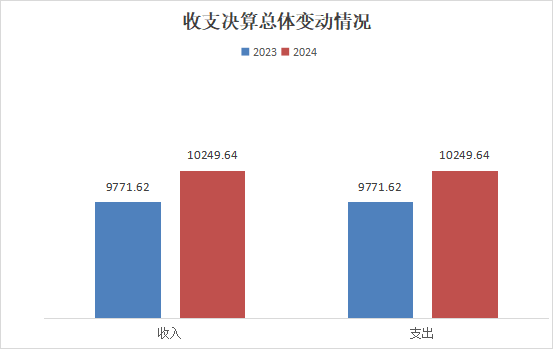 2024年度财政拨款收入、支出总计均为10,249.64万元。与2023年度相比,财政拨款收入总计、支出总计各增加478.02万元,增长4.89%。主要变动原因是项目增加,项目资金增加。