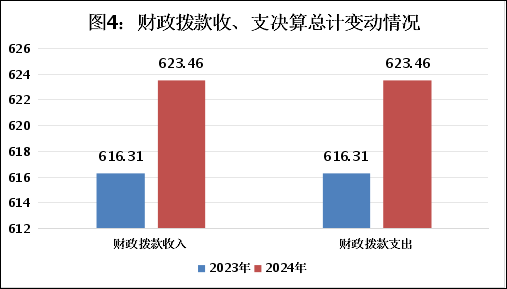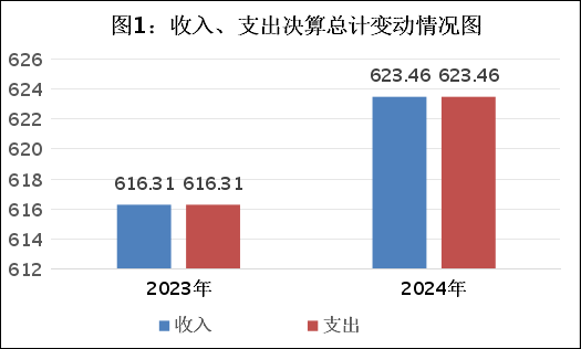 2024年度财政拨款收入、支出总计均为623.46万元。与2023年度相比,财政拨款收入总计、支出总计各增加7.15万元,增长1.16%。主要变动原因是人员增加。