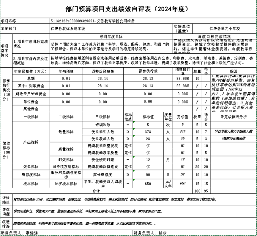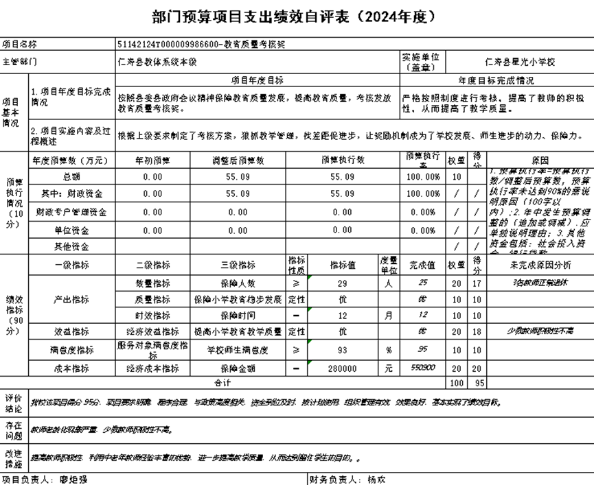 根据预算绩效管理要求,我单位在2024年度预算编制阶段,组织对教育质量奖等2个项目开展了预算事前绩效评估,对2个项目编制了绩效目标;预算执行过程中,对2个项目开展绩效监控;年终执行完毕后,组织对2个项目开展绩效自评,形成0个专项预算项目绩效自评报告,2个部门预算项目绩效自评表,《部门预算项目支出绩效自评表(2024年度)》见附表十四(第五部分)。