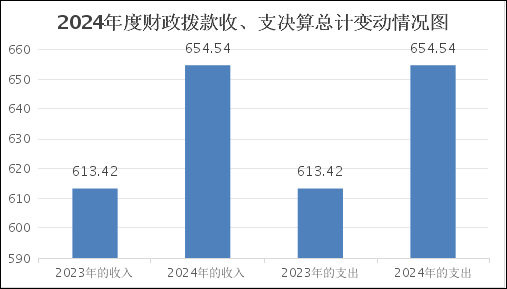 2024年度财政拨款收入、支出总计均为654.54万元。与2023年度相比,财政拨款收入总计、支出总计各增加41.12万元,增长6.70%。主要变动原因是教职工工资增加、保障性支出增加、学校校园环境的改善和学校校园文化的建设投入增加。
