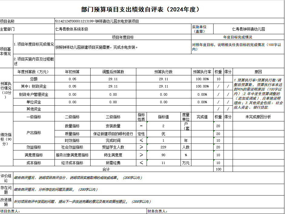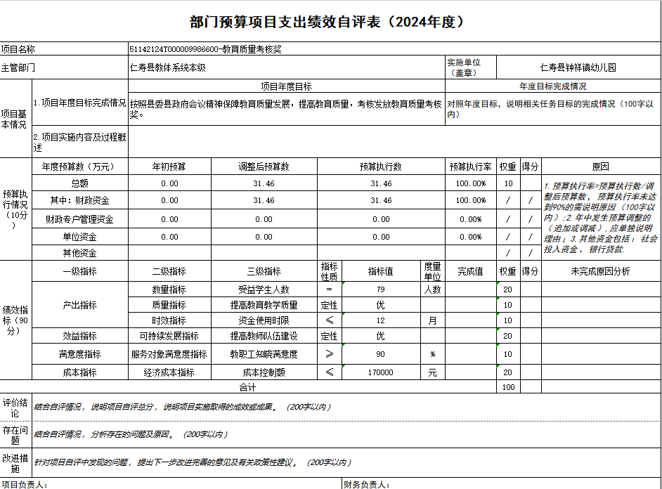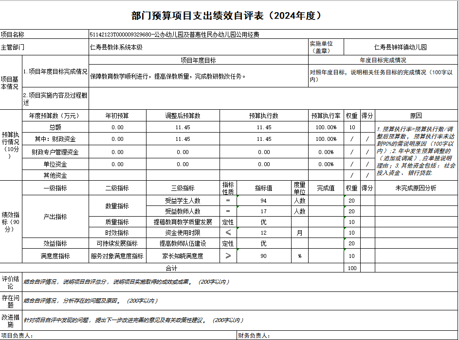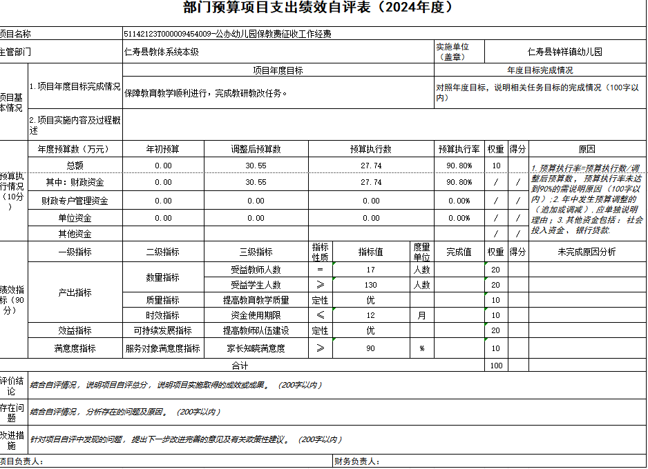 根据预算绩效管理要求,仁寿县钟祥镇幼儿园在2024年度预算编制阶段,组织对公办幼儿园及普惠性民办幼儿园公用经费、公办幼儿园保教费征收工作经费、教育质量考核奖、钟祥镇幼儿园水电安装项目等4个项目开展了预算事前绩效评估,对4个项目编制了绩效目标;预算执行过程中,对4个项目开展绩效监控;年终执行完毕后,组织对4个项目开展绩效自评,形成4个部门预算项目绩效自评表,《部门预算项目支出绩效自评表(2024年度)》见附表十四(第四部分)。