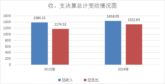 2024年度收入1438.05万元,与2023年度相比收入增加53.92万元,增加3.9%,主要变动原因是医疗收入增加。支出总计1322.65万元,与2023年度相比支出增加148.13万元,增加12.61%,主要变动原因是医疗收入增加同比支出增加。