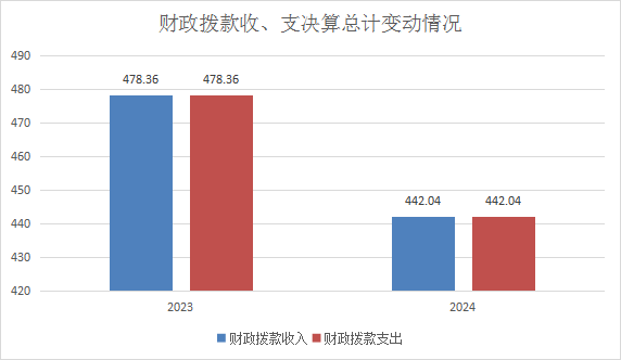 2024年度财政拨款收入总计为442.04万元,支出总计为442.04万元,与2023年度相比财政拨款收入总计减少36.32万元,下降7.59%。主要变动原因是项目经费减少。