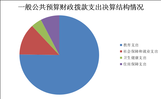 2024年一般公共预算财政拨款支出2422.54万元,主要用于以下方面:一般公共服务(类)支出0万元,占0%;教育支出(类)1822.34万元,占75.91%;科学技术(类)支出0万元,占0%;文化旅游体育与传媒(类)支出0万元,占0%;社会保障和就业(类)支出310.69万元,占12.82%;卫生健康支出104.07万元,占4.3%;住房保障支出185.44万元,占7.65%。