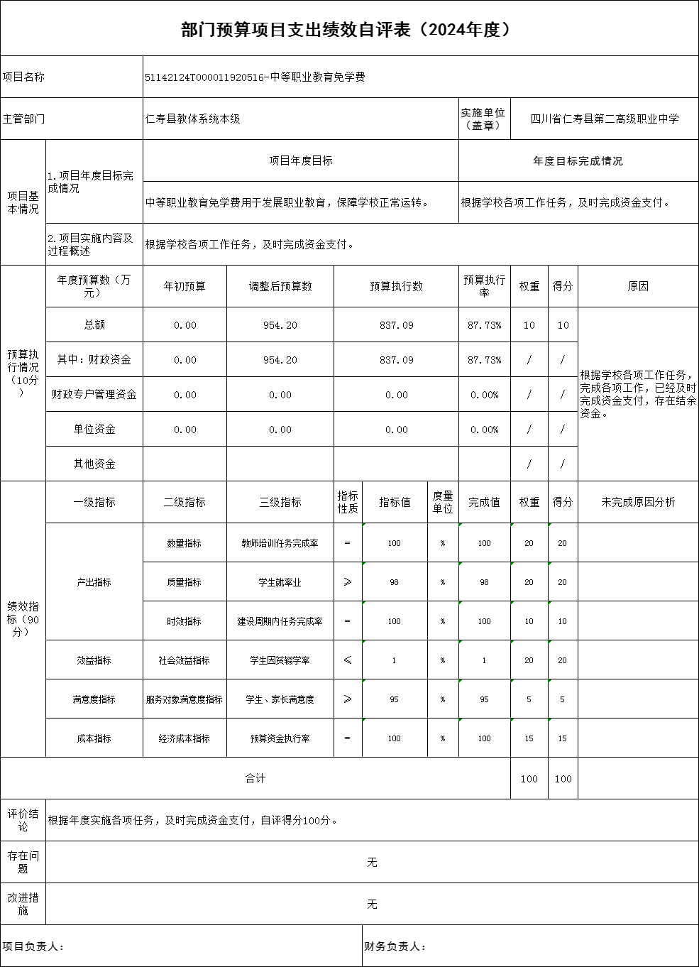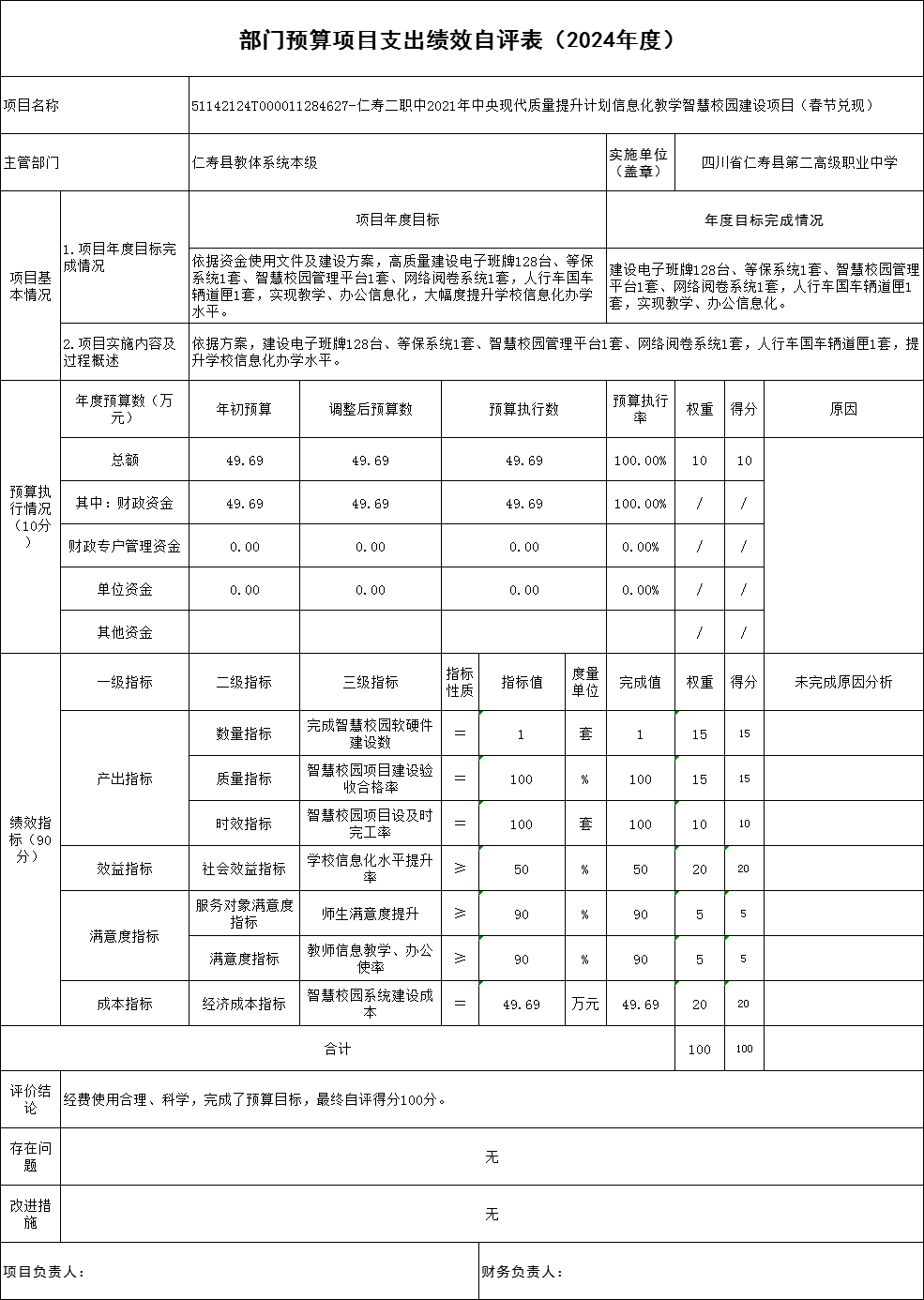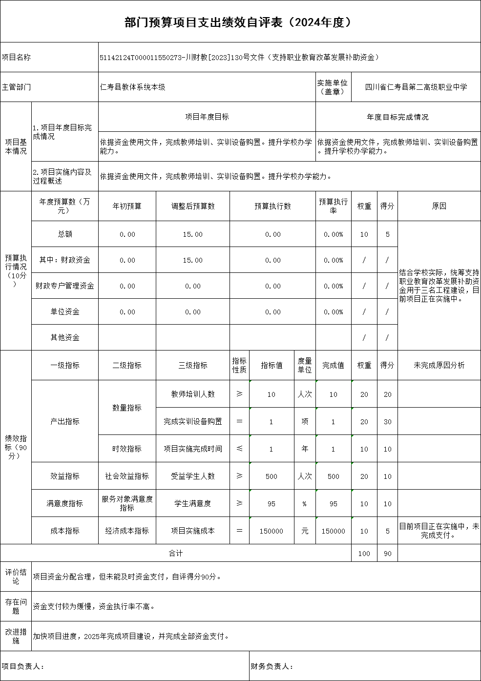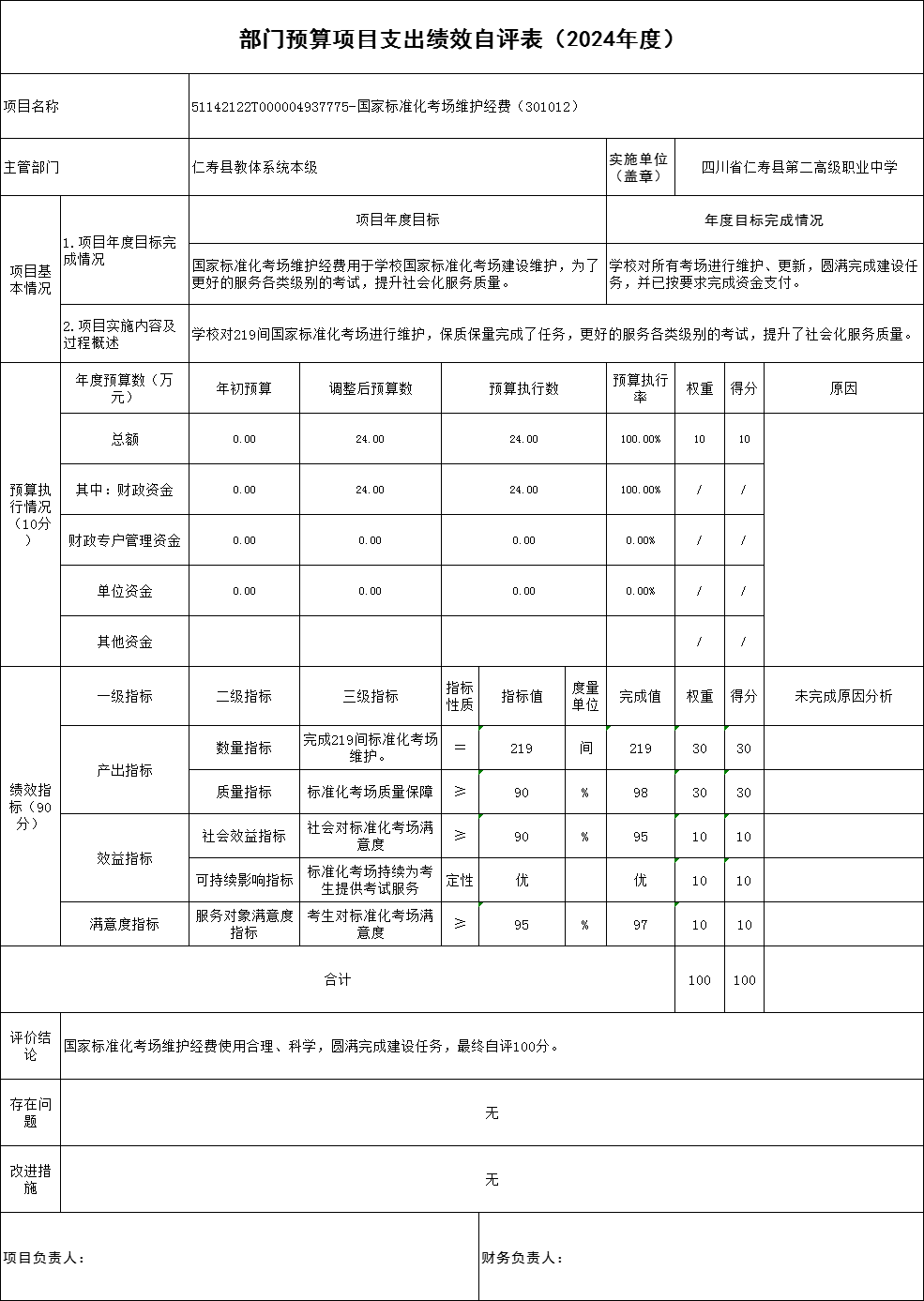 根据预算绩效管理要求,四川省仁寿县第二高级职业中学在2024年度预算编制阶段,组织对国家标准化考场维护经费等11个项目开展了预算事前绩效评估,对11个项目编制了绩效目标;预算执行过程中,对11个项目开展绩效监控;年终执行完毕后,组织对11个项目开展绩效自评, 11个部门预算项目绩效自评表,《部门预算项目支出绩效自评表(2024年度)》见附表十四(第五部分)。