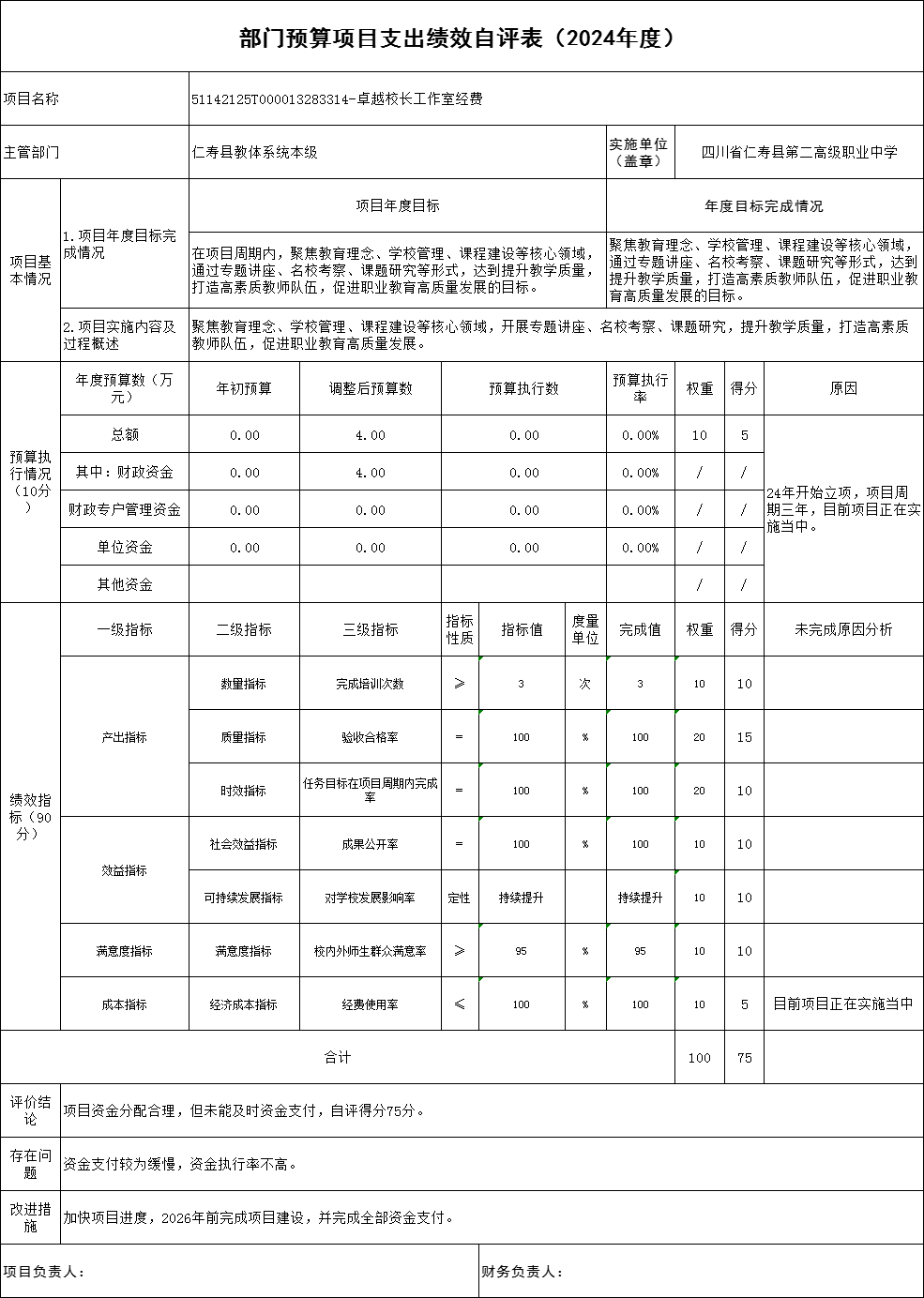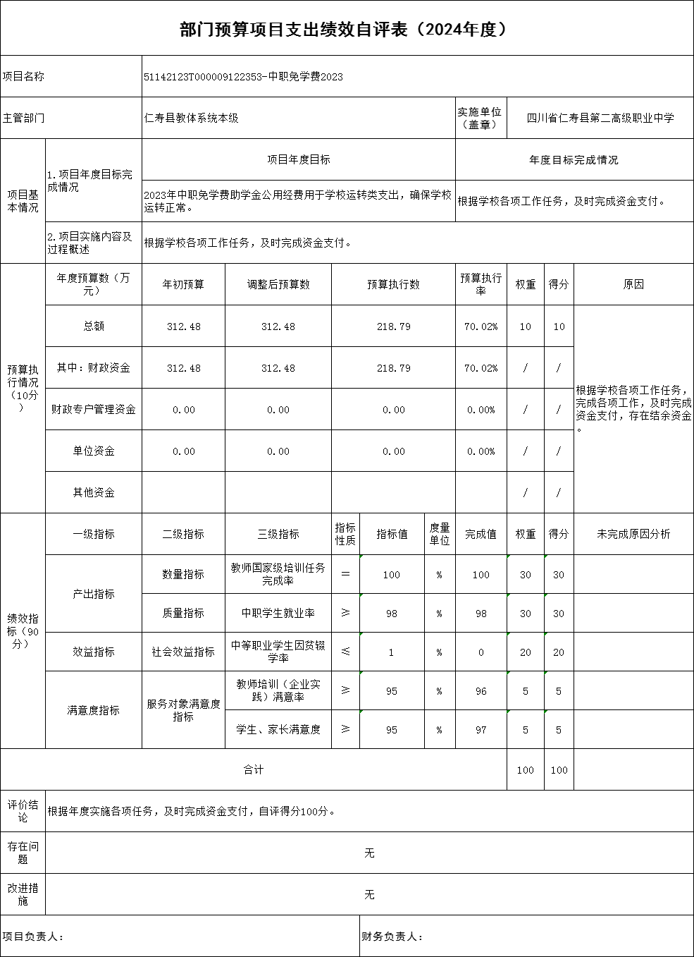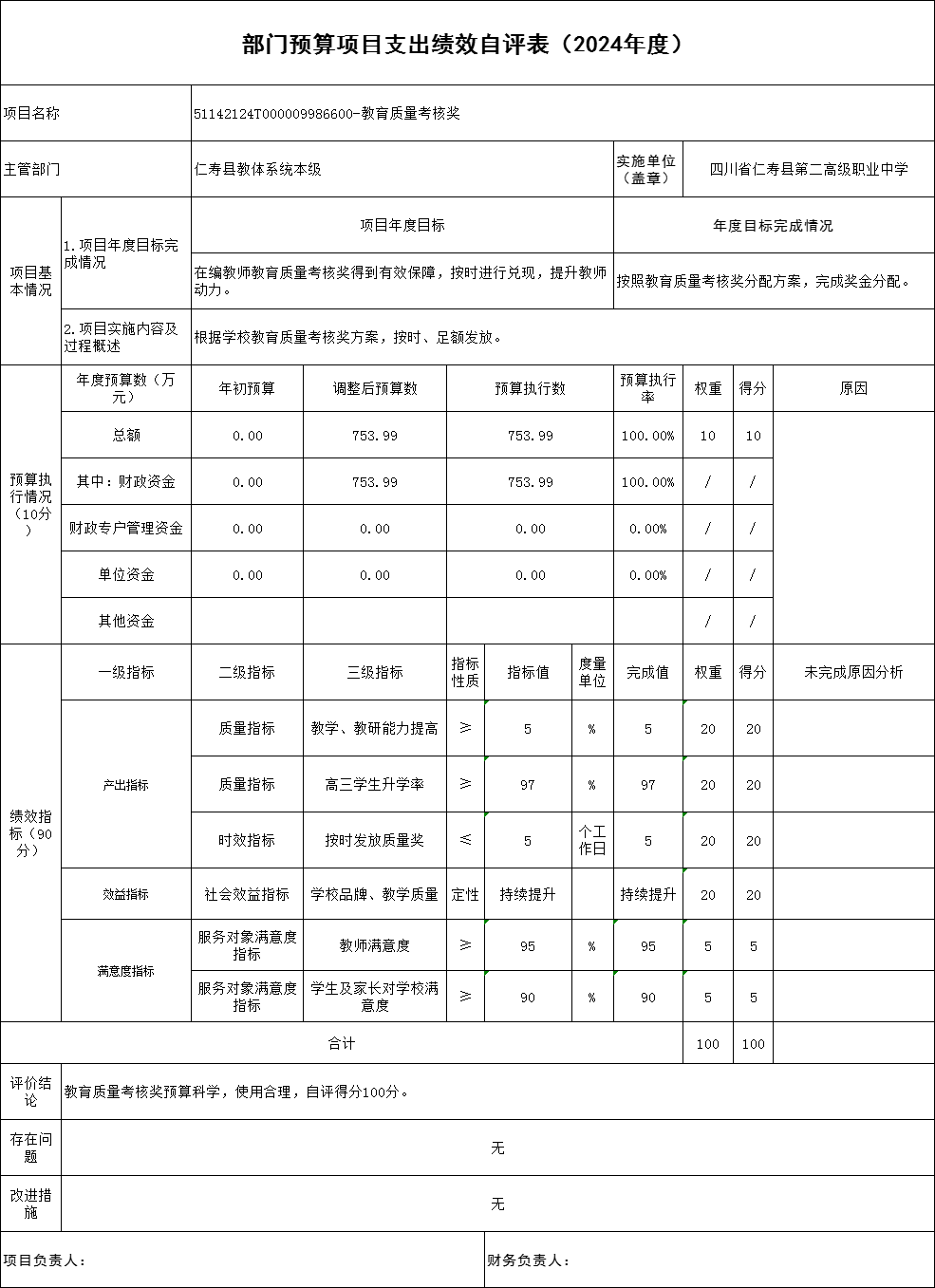 根据预算绩效管理要求,四川省仁寿县第二高级职业中学在2024年度预算编制阶段,组织对国家标准化考场维护经费等11个项目开展了预算事前绩效评估,对11个项目编制了绩效目标;预算执行过程中,对11个项目开展绩效监控;年终执行完毕后,组织对11个项目开展绩效自评, 11个部门预算项目绩效自评表,《部门预算项目支出绩效自评表(2024年度)》见附表十四(第五部分)。