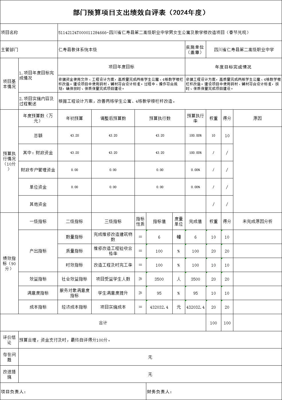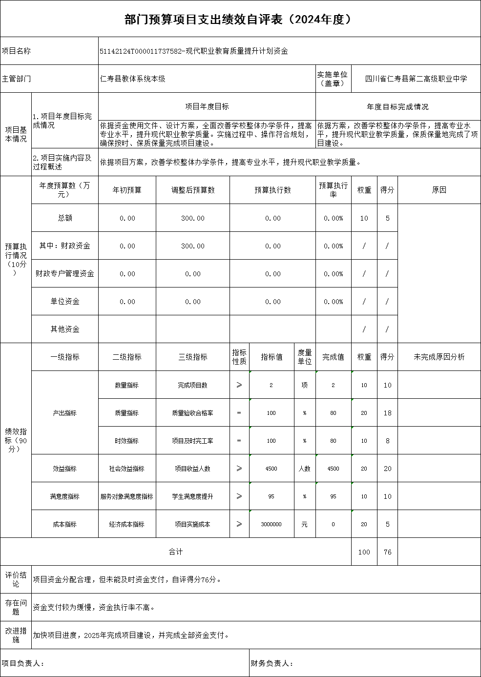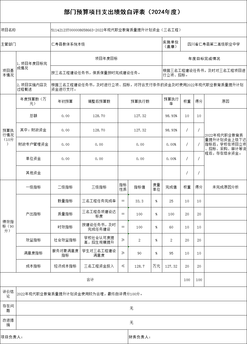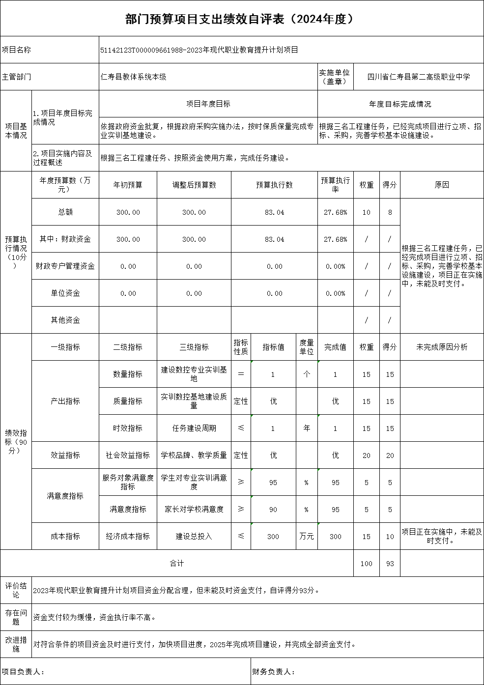 根据预算绩效管理要求,四川省仁寿县第二高级职业中学在2024年度预算编制阶段,组织对国家标准化考场维护经费等11个项目开展了预算事前绩效评估,对11个项目编制了绩效目标;预算执行过程中,对11个项目开展绩效监控;年终执行完毕后,组织对11个项目开展绩效自评, 11个部门预算项目绩效自评表,《部门预算项目支出绩效自评表(2024年度)》见附表十四(第五部分)。