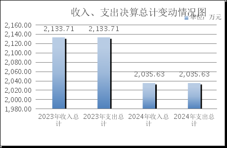2024年度收入总计为2035.63万元,支出总计为2035.63万元。与2023年度相比,收入总计减少98.08万元,减少4.60%;支出总计减少98.08万元,减少4.60%。主要人员类经费减少。