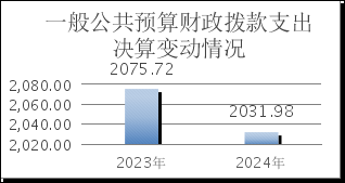 2024年度一般公共预算财政拨款支出2031.98万元,占本年支出合计的99.82%。与2023年度相比,一般公共预算财政拨款支出减少43.74万元,减少2.11%。主要人员类经费减少。